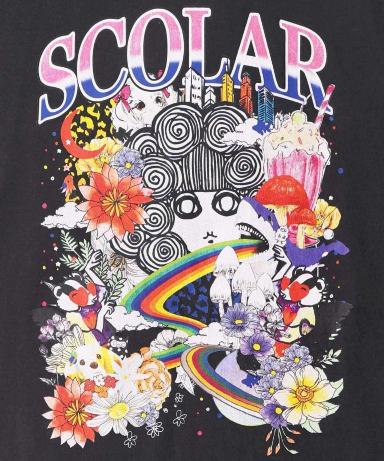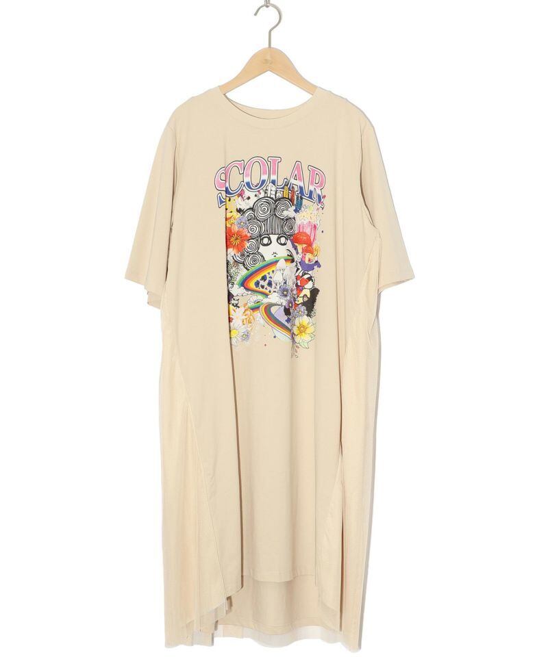 スカラーちゃんやお花のカラフルなプリントが目を惹くワンピース。