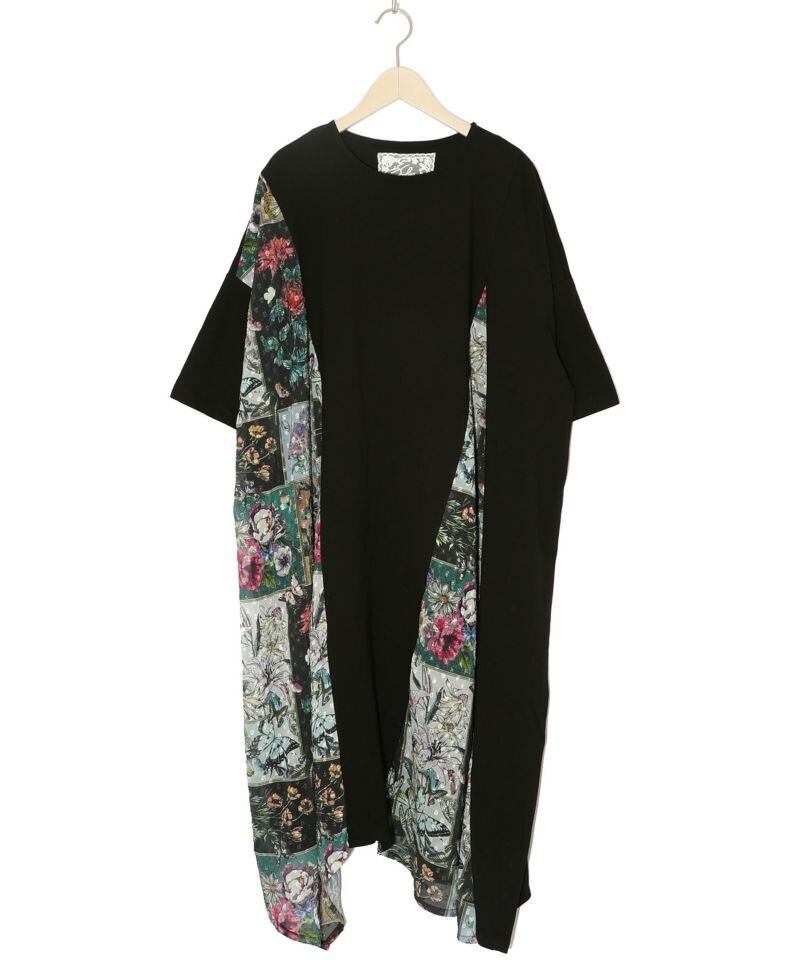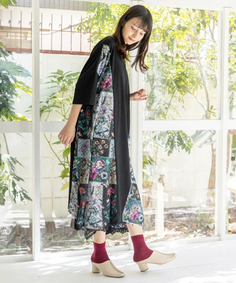 ISScoLar(イズスカラー)花蝶パッチワーク柄 切替ワンピース アイボリー、ブラック 551244