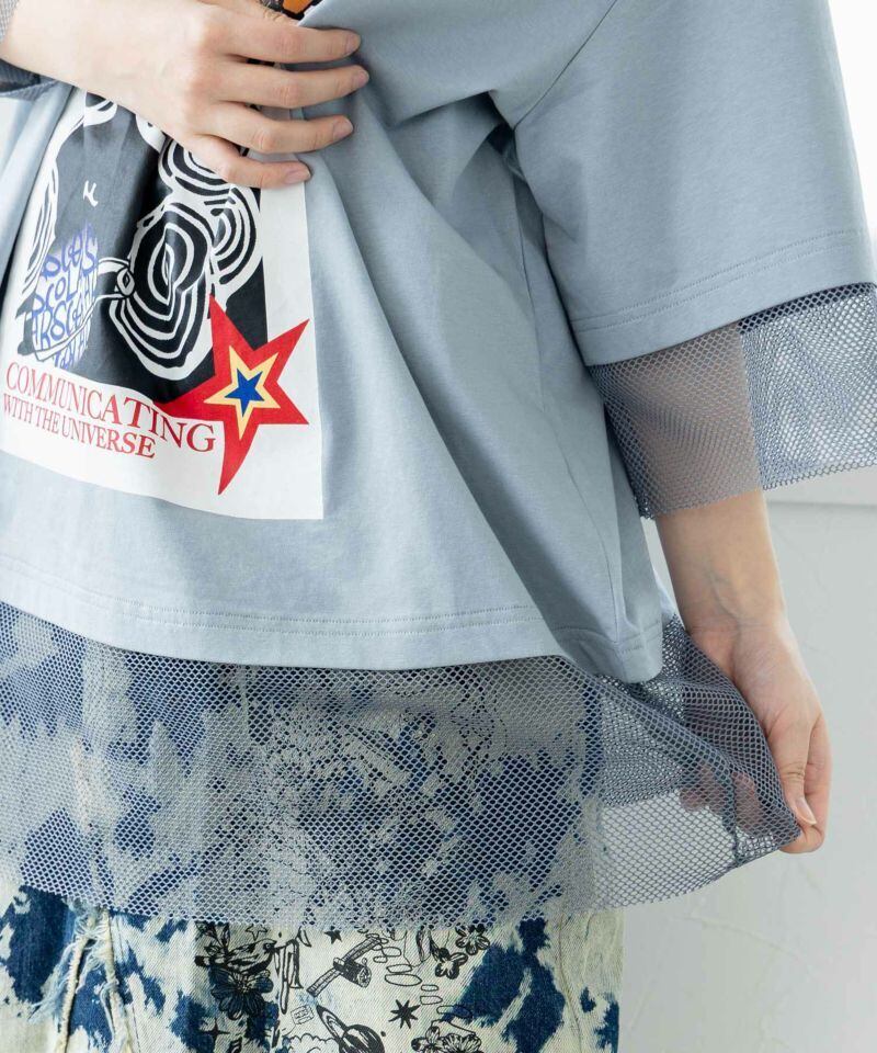 トレンドのメッシュ素材を切り替えたレイヤード風デザインTシャツ。