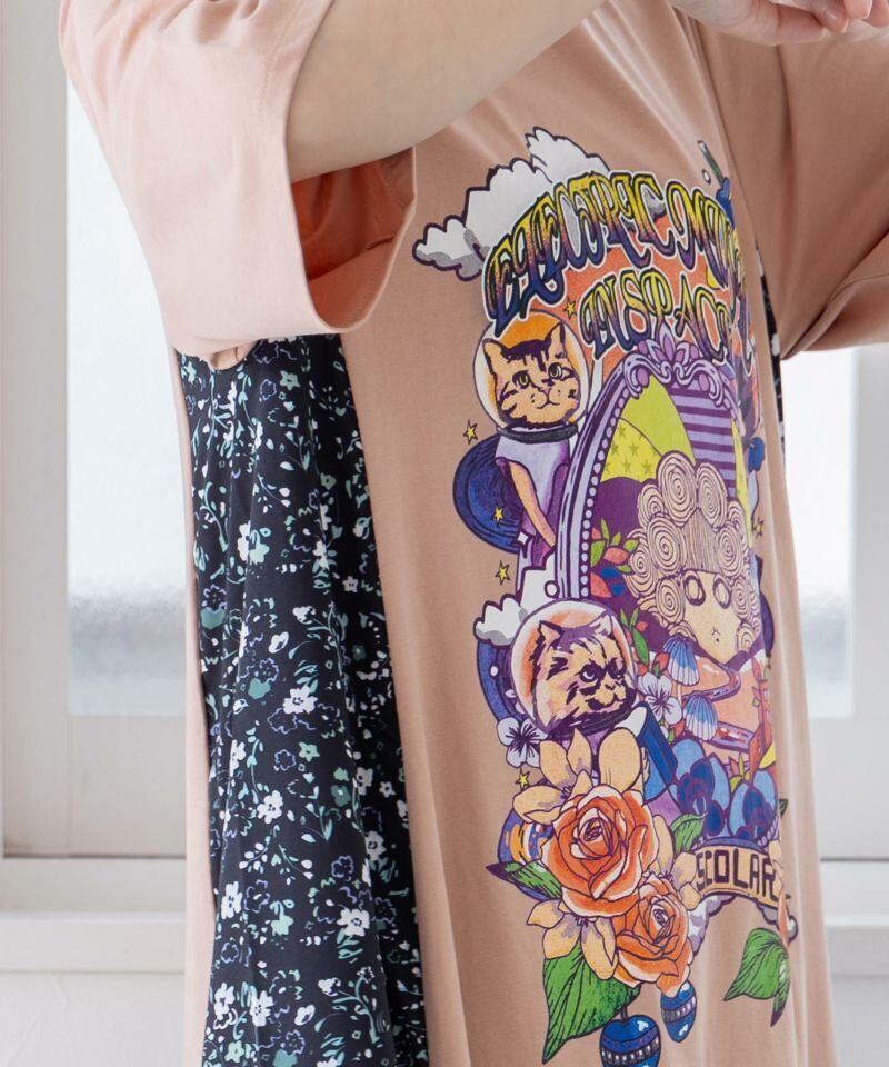 ScoLar(スカラー)宇宙ネコとスカラーちゃん 小花柄切替ワンピース ブラック、ピンク 152632です。
