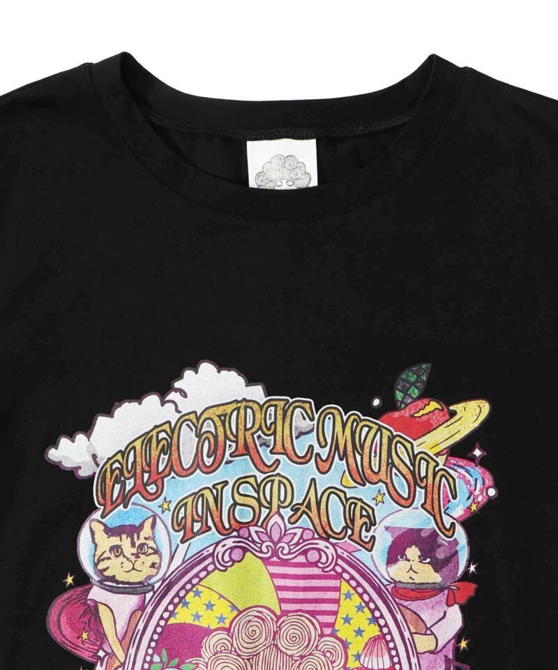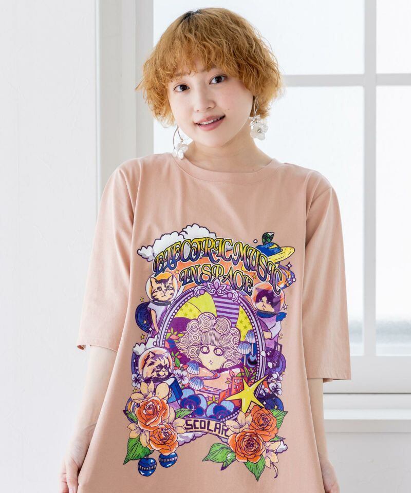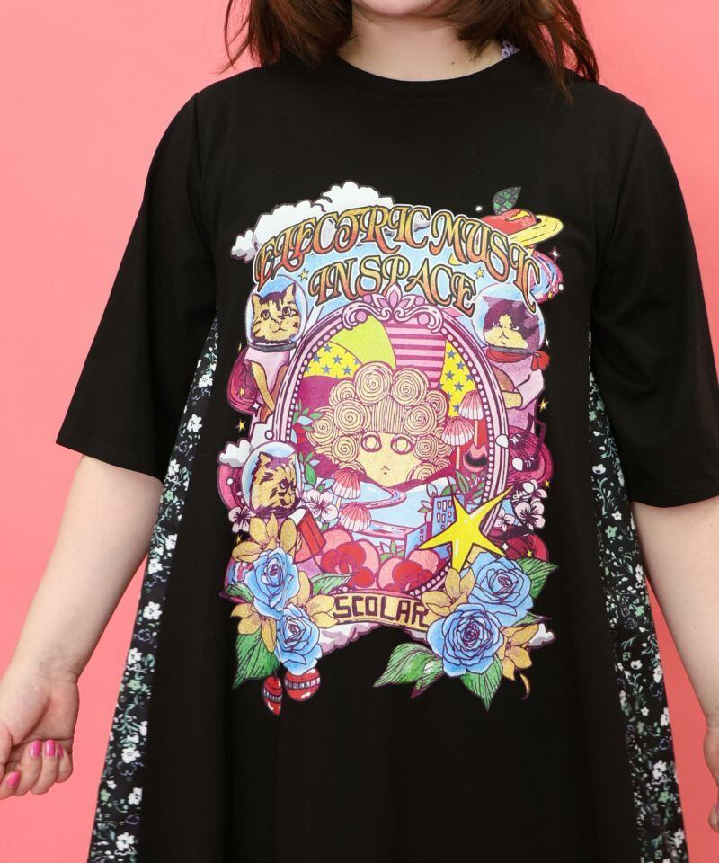 宇宙ネコとスカラーちゃんのプリントがインパクトたっぷりなワンピースです。