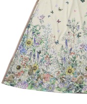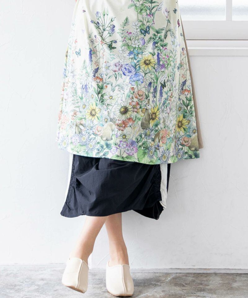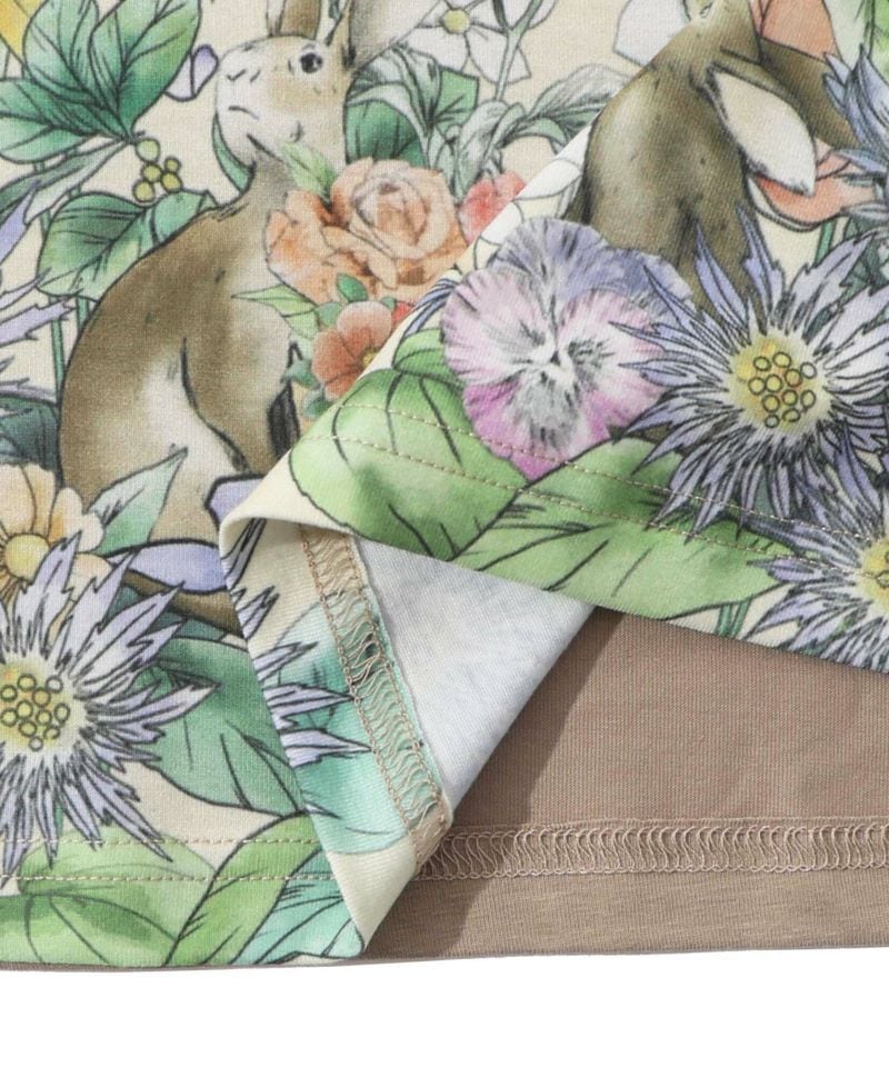 お花畑にウサギや蝶々が集まってきた華やかプリントと、
