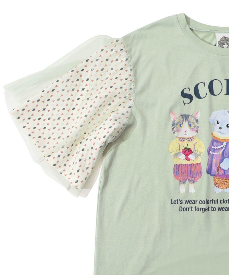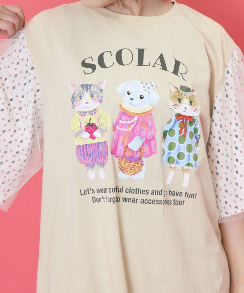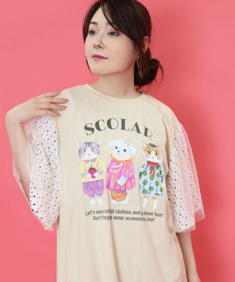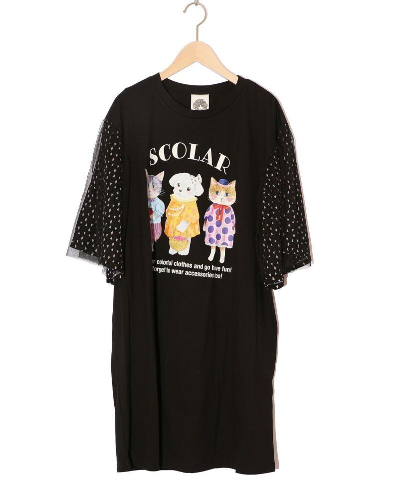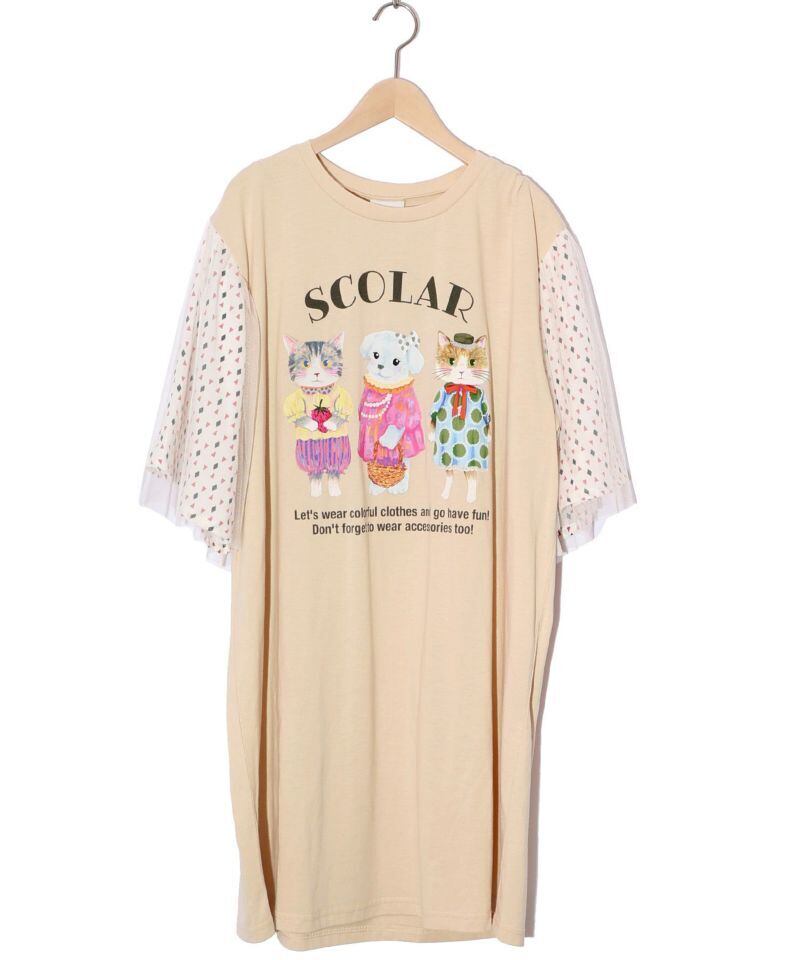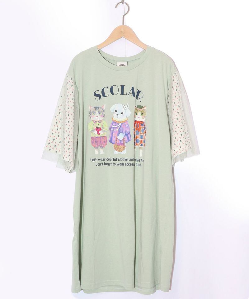 ScoLar(スカラー)おしゃれネコとワンコのアニマル柄 チュール袖ワンピース アイボリー、ブラック、グリーン 151675 です。