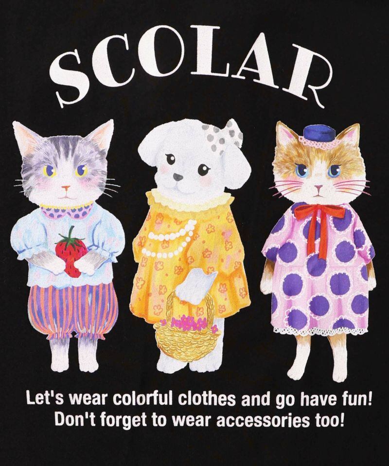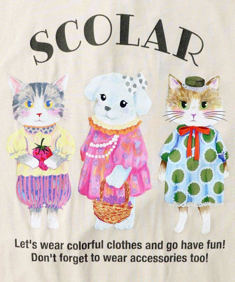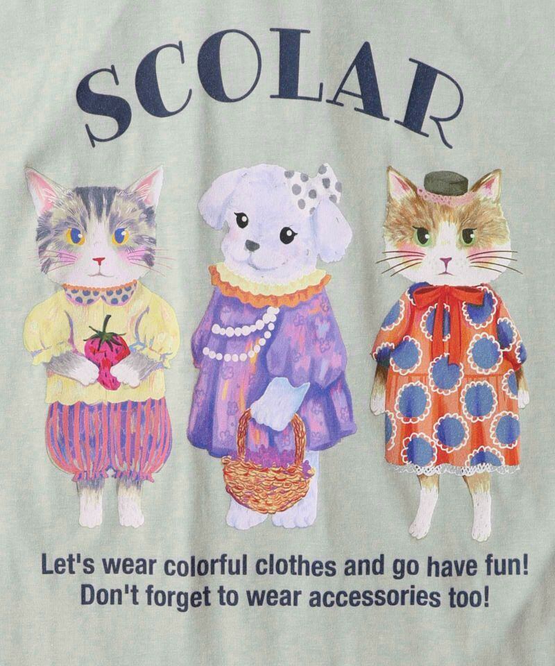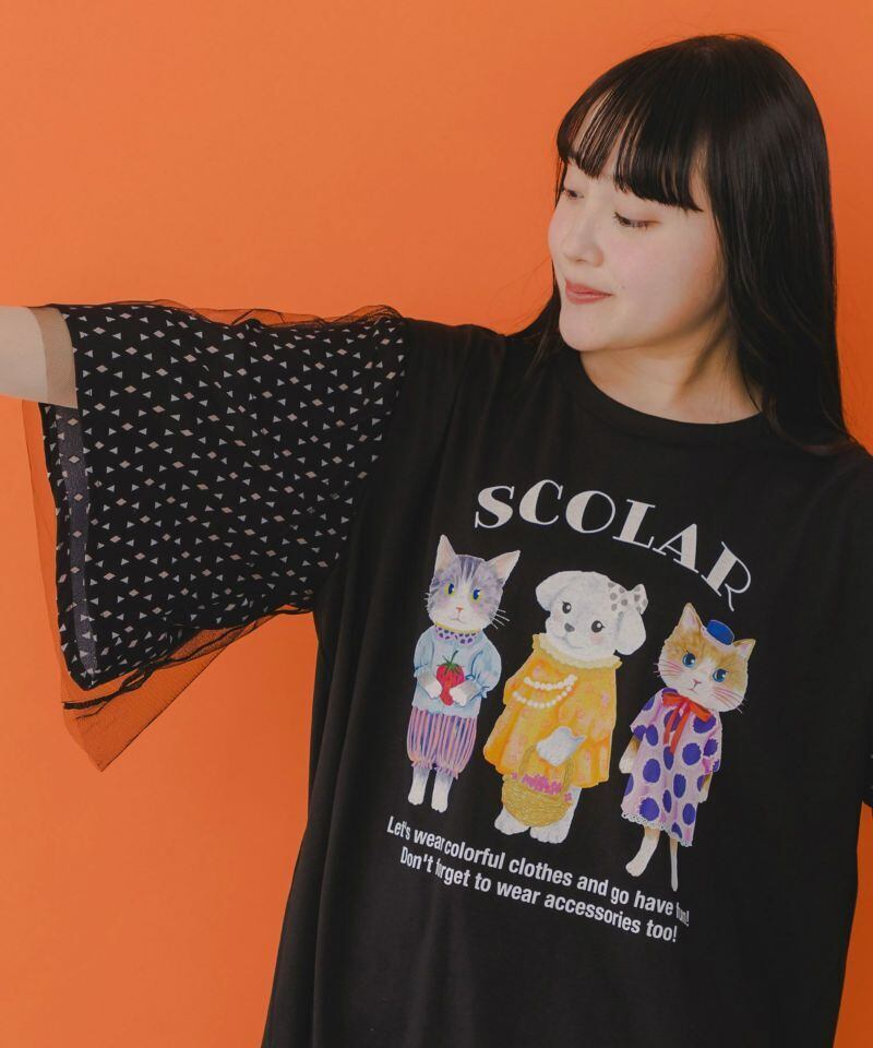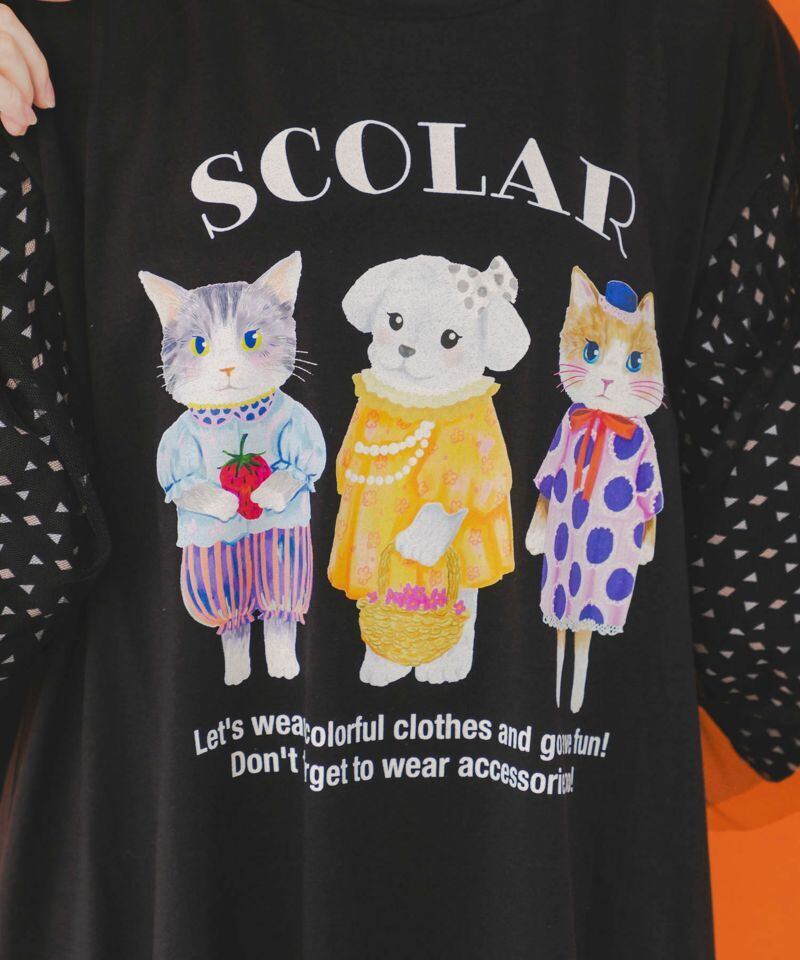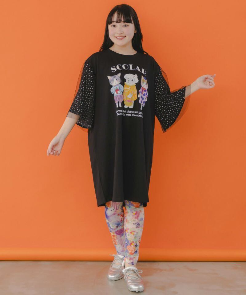 ScoLar(スカラー)おしゃれネコとワンコのアニマル柄 チュール袖ワンピース アイボリー、ブラック、グリーン 151675 です。