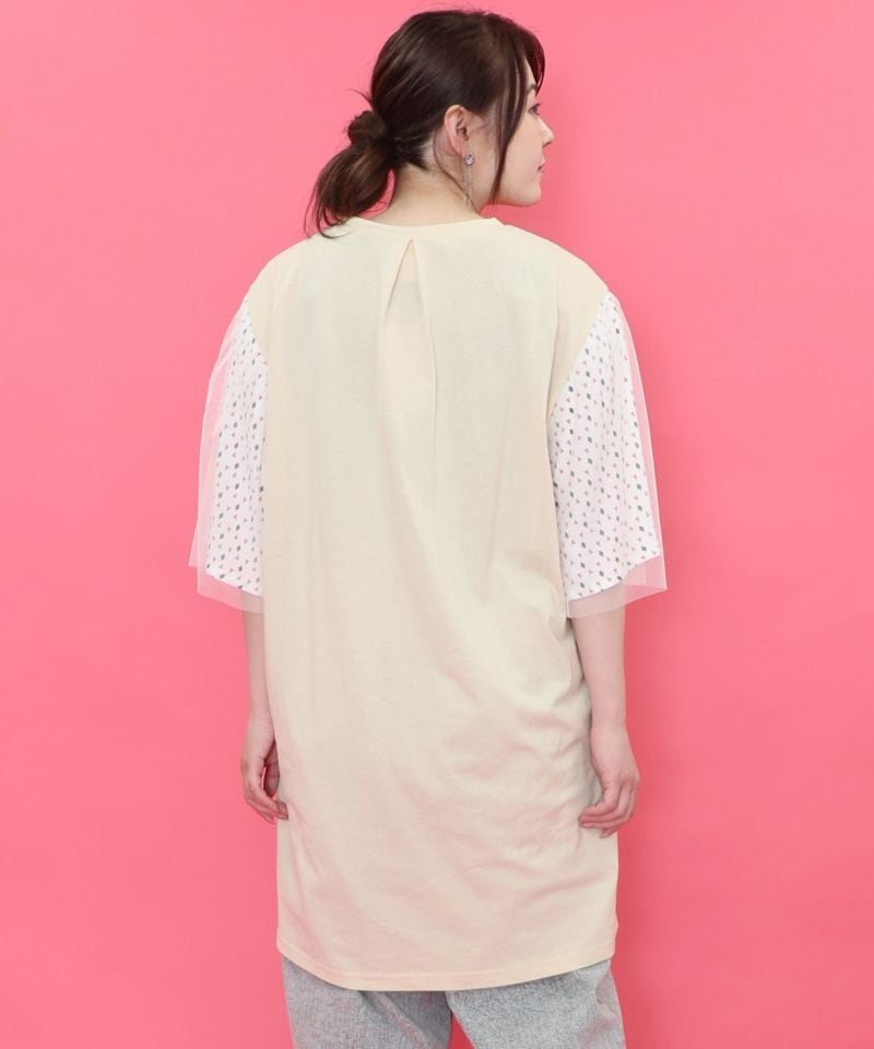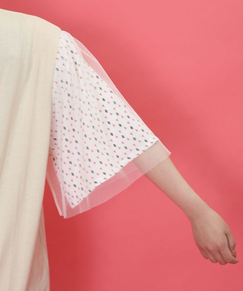 袖に柄プリント生地を切り替え、さらに上からふんわりチュールを重ねた