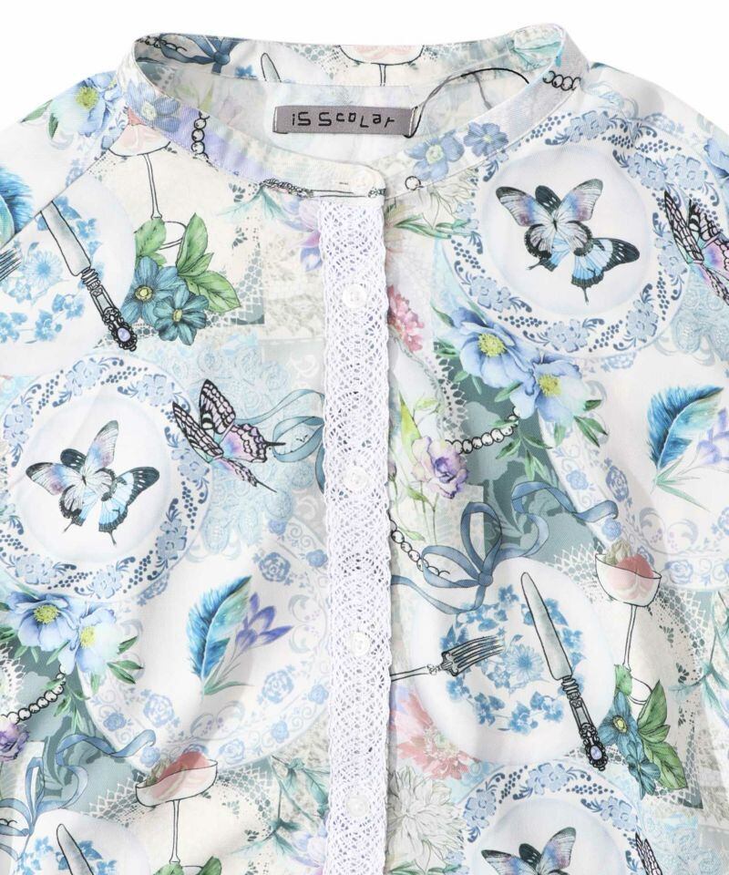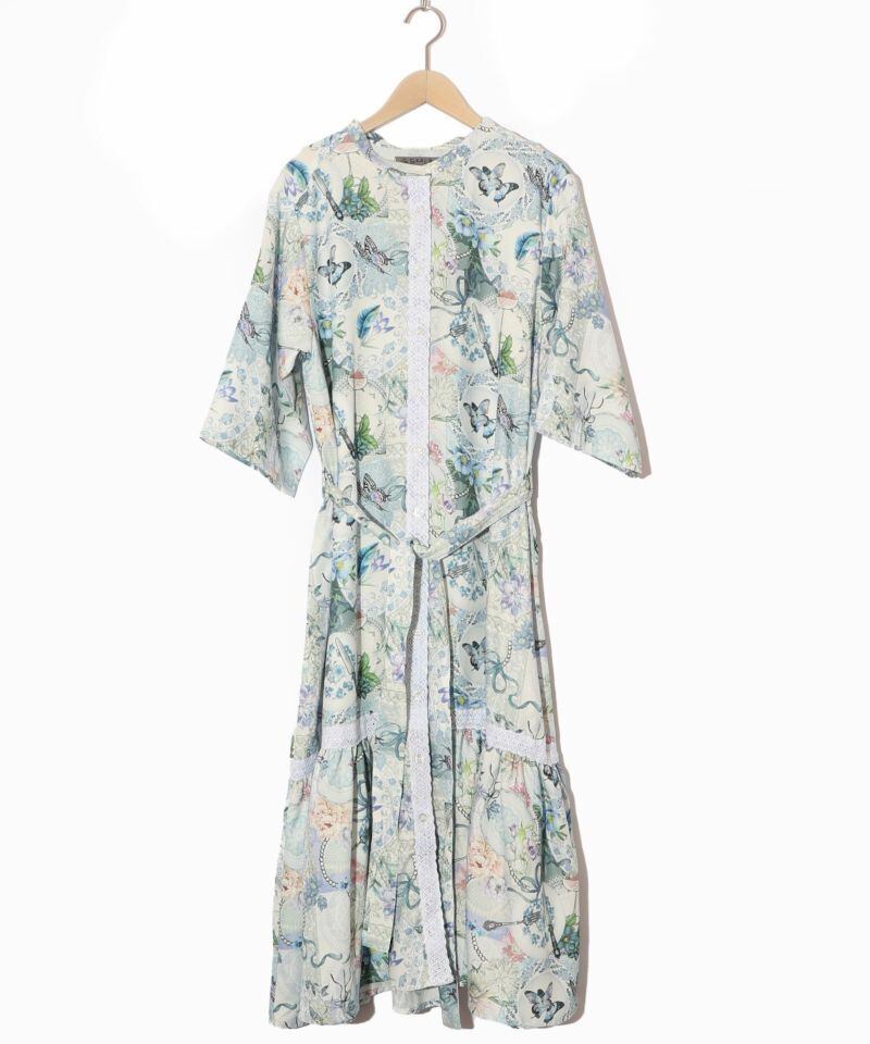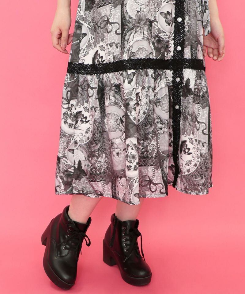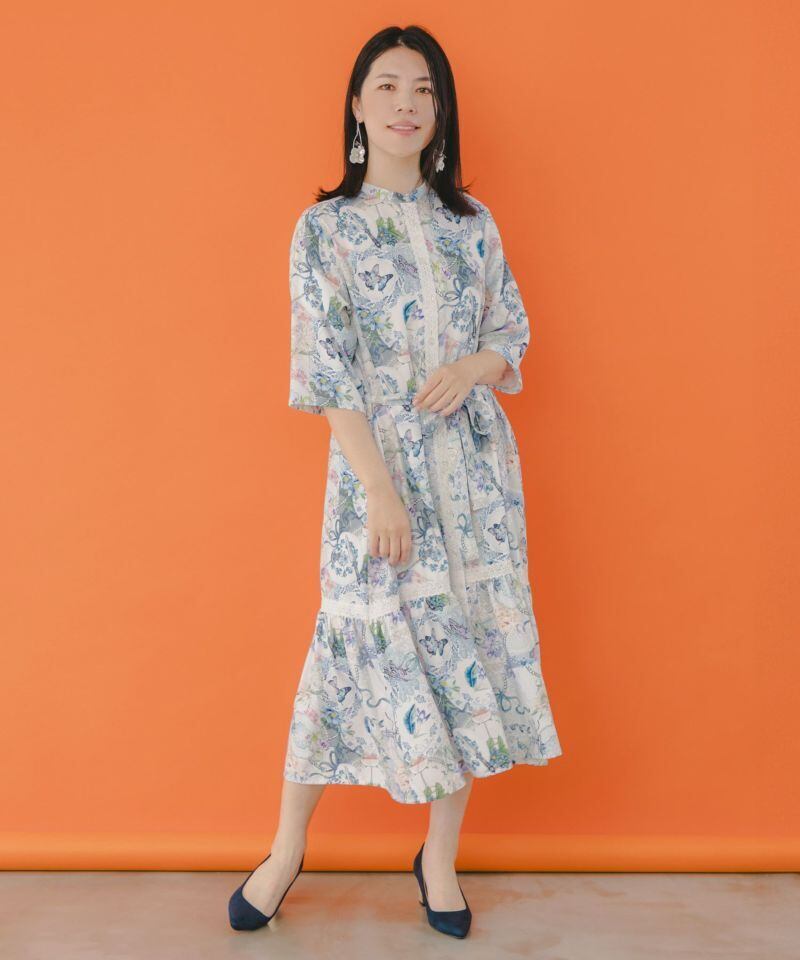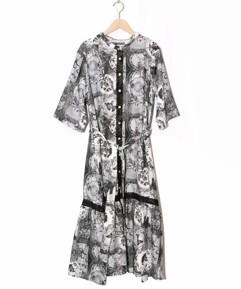 ISScoLar(イズスカラー)花蝶カトラリー×レースプリント前開きワンピース オフホワイト、ブラック 551229です。