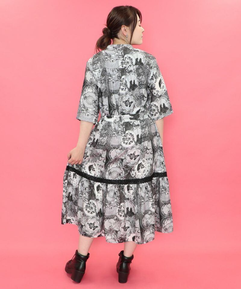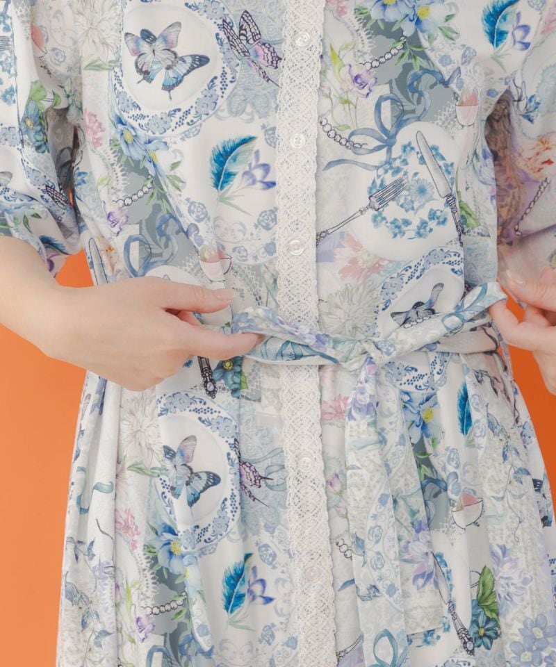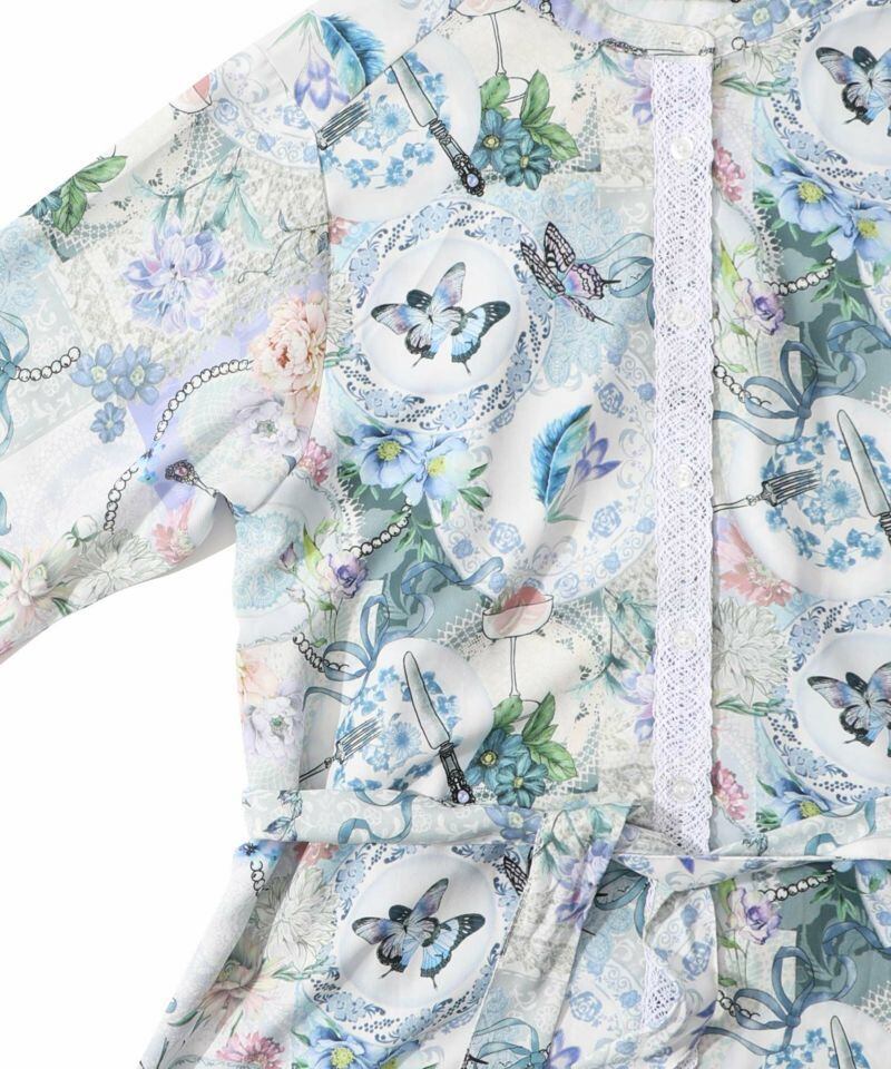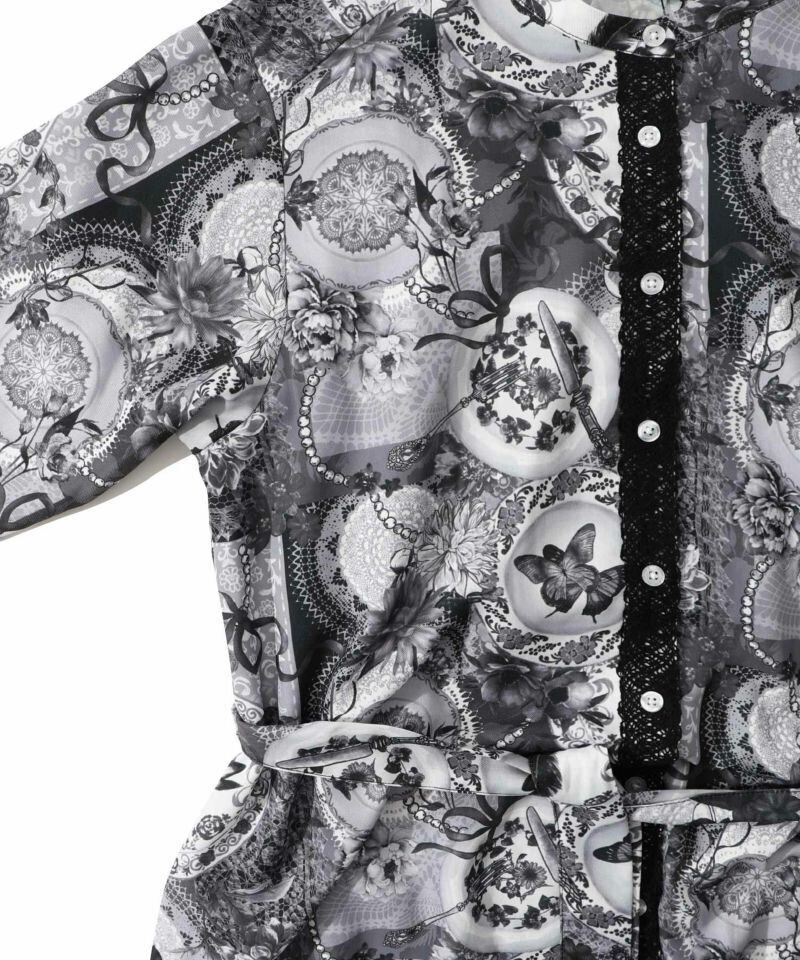 カトラリーやお皿、レースにお花をコラージュした華やかな総柄ワンピース。