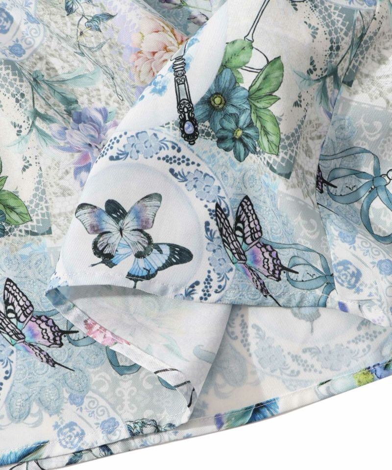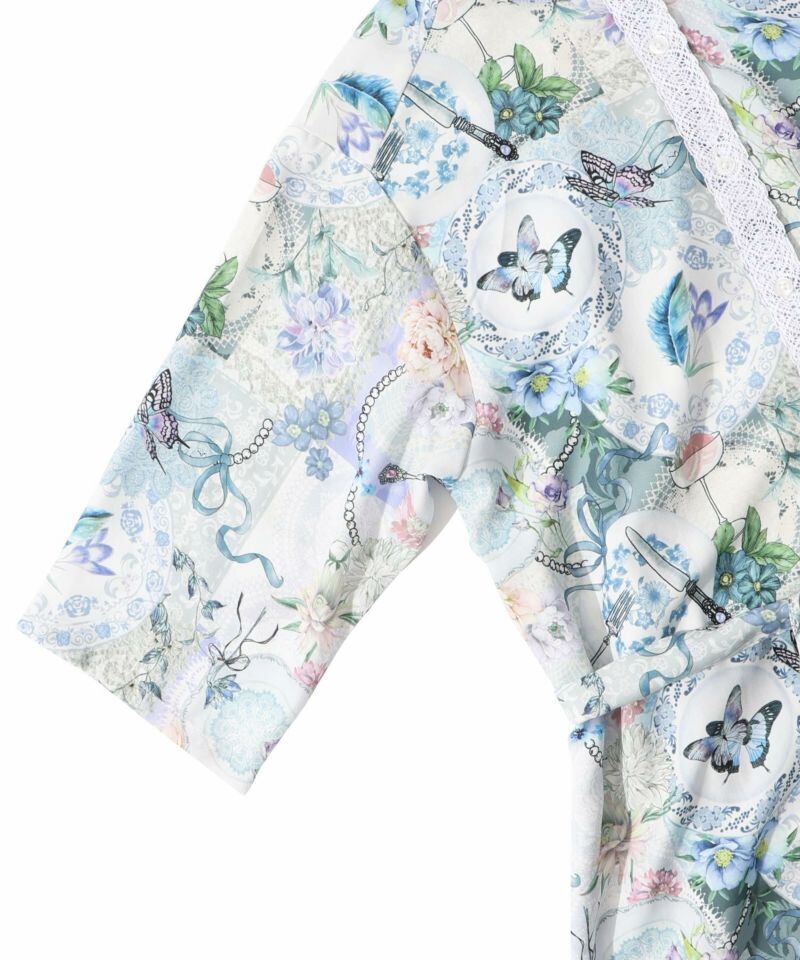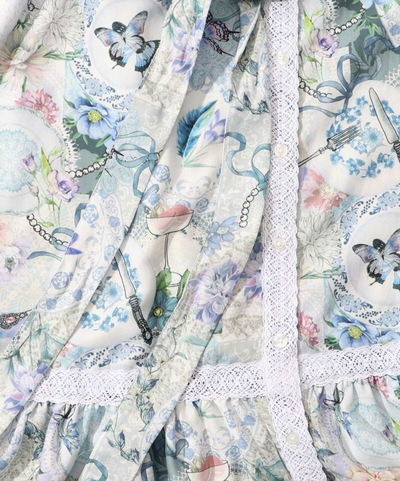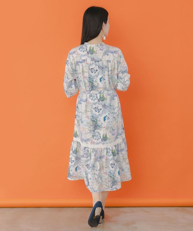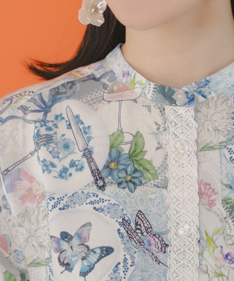カトラリーやお皿、レースにお花をコラージュした華やかな総柄ワンピース。