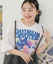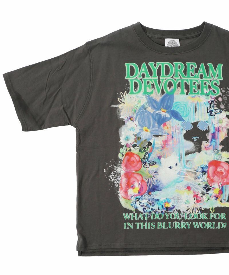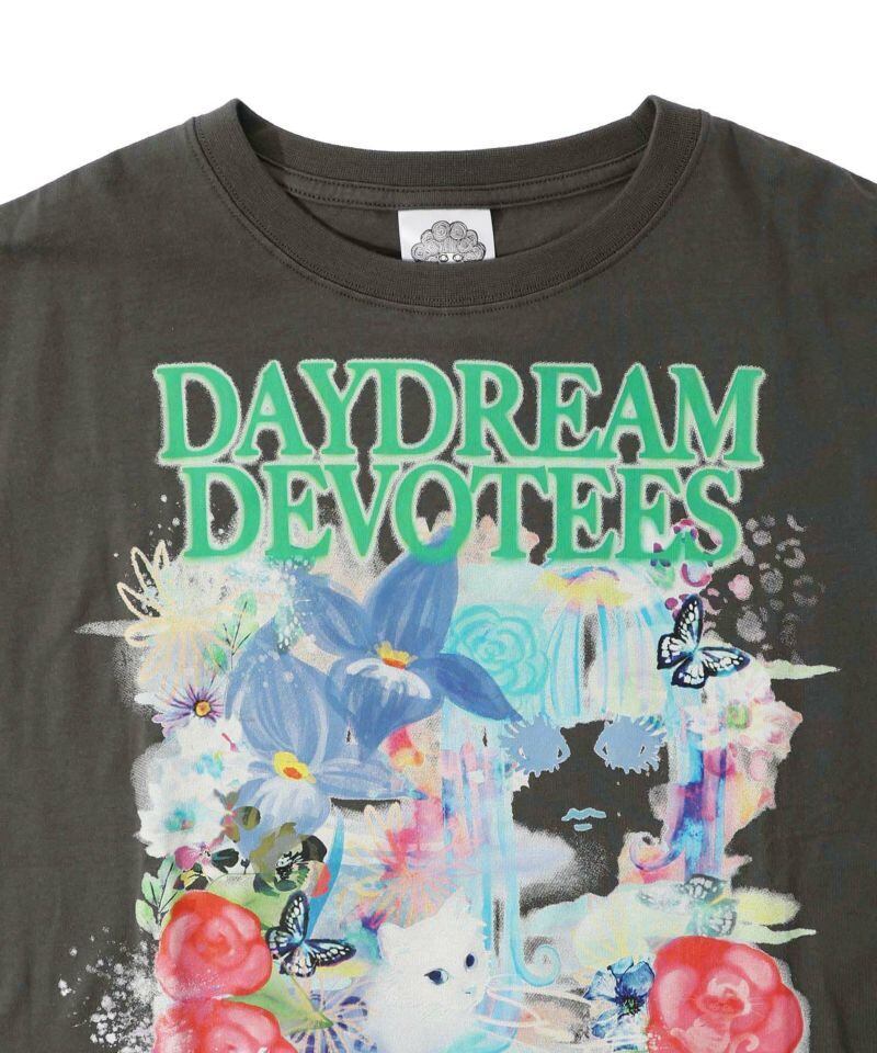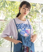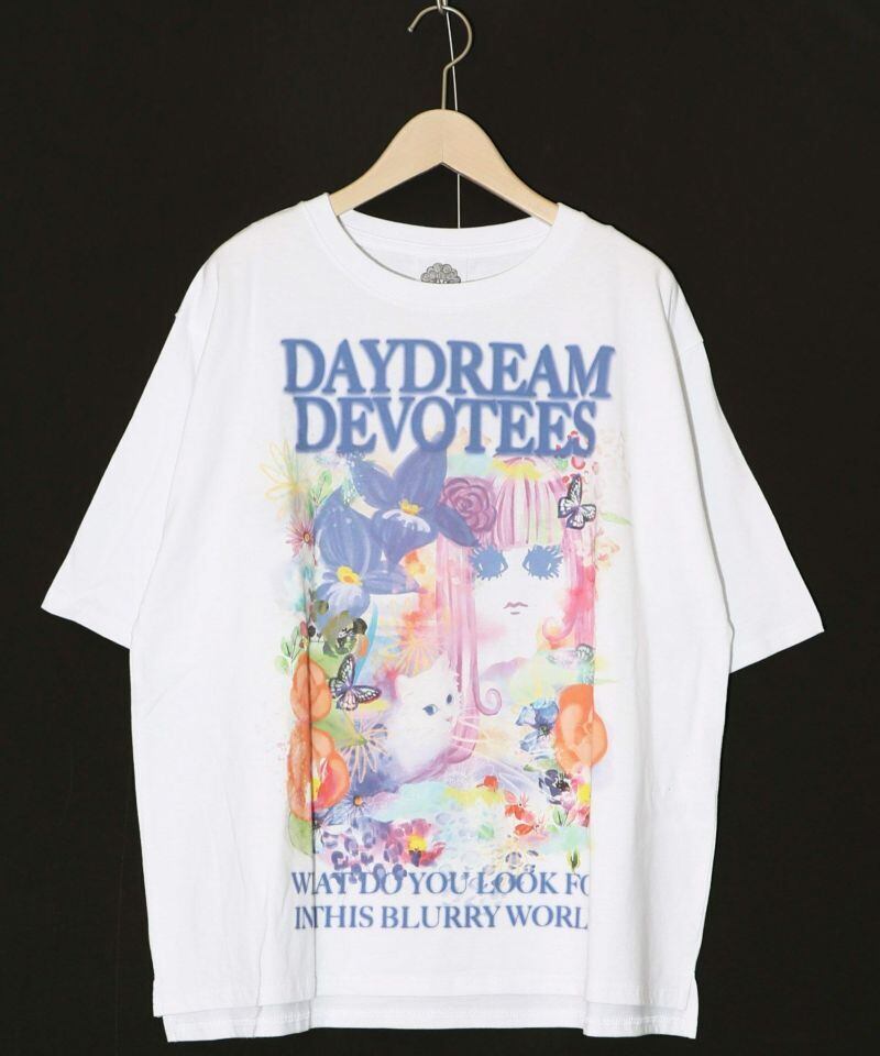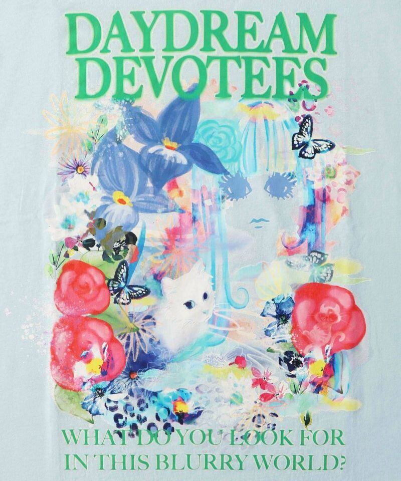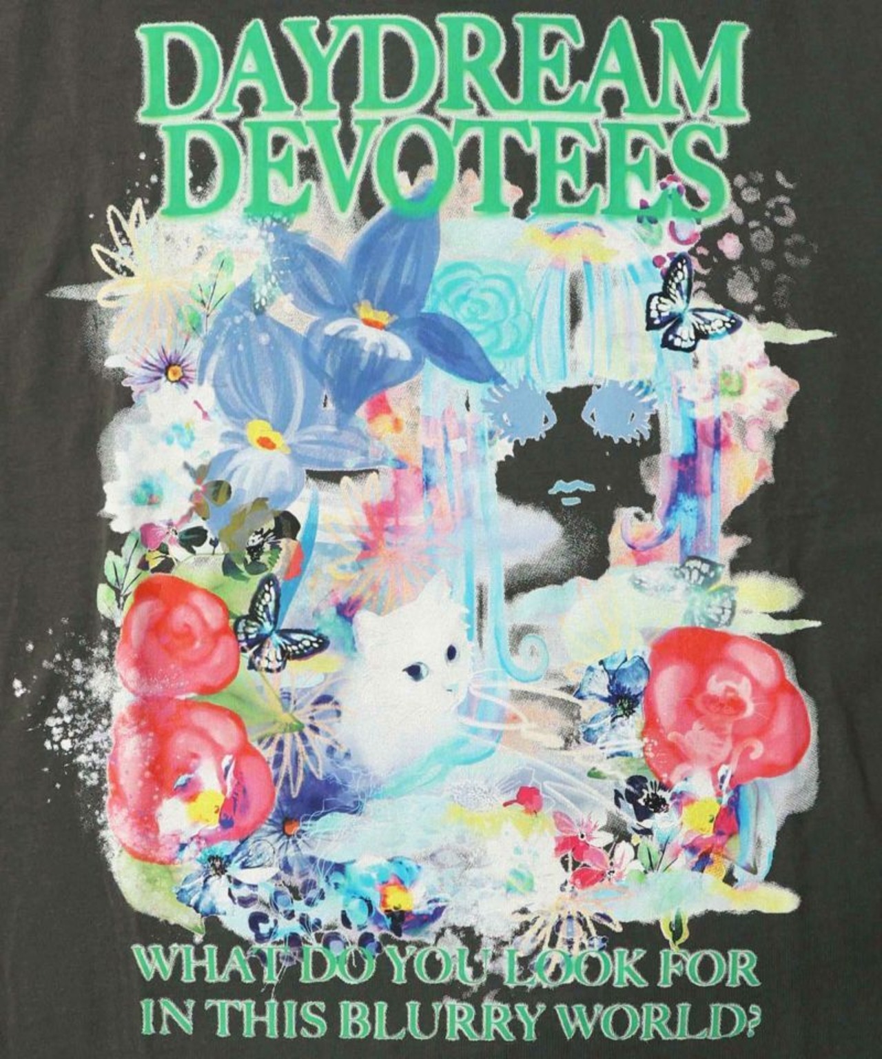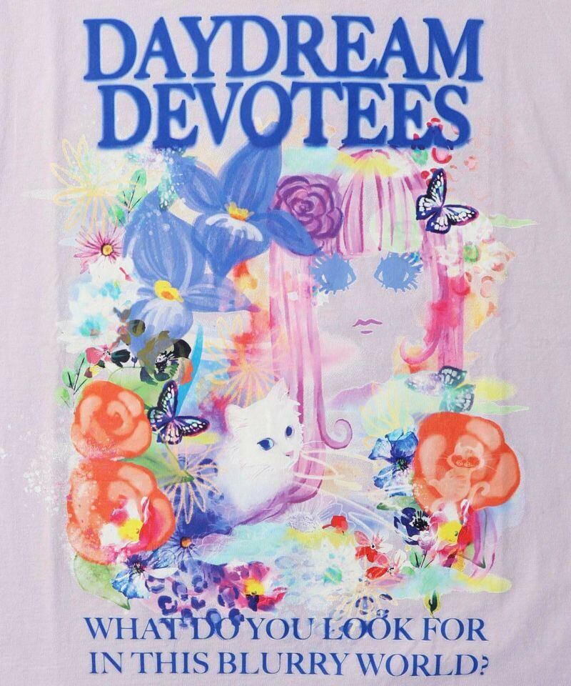 カラフルなお花や蝶々柄のなかに、女の子やネコが浮かんだメルヘンなデザインTシャツ。