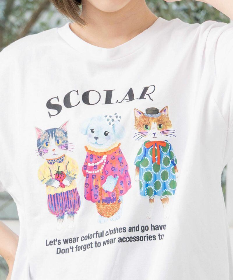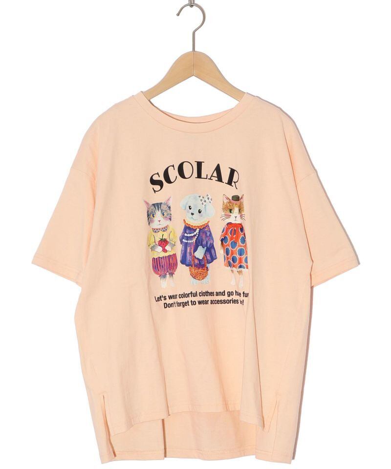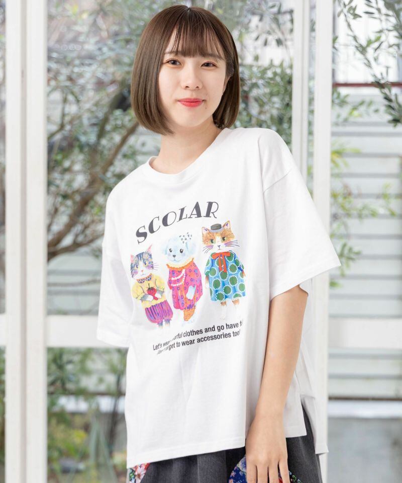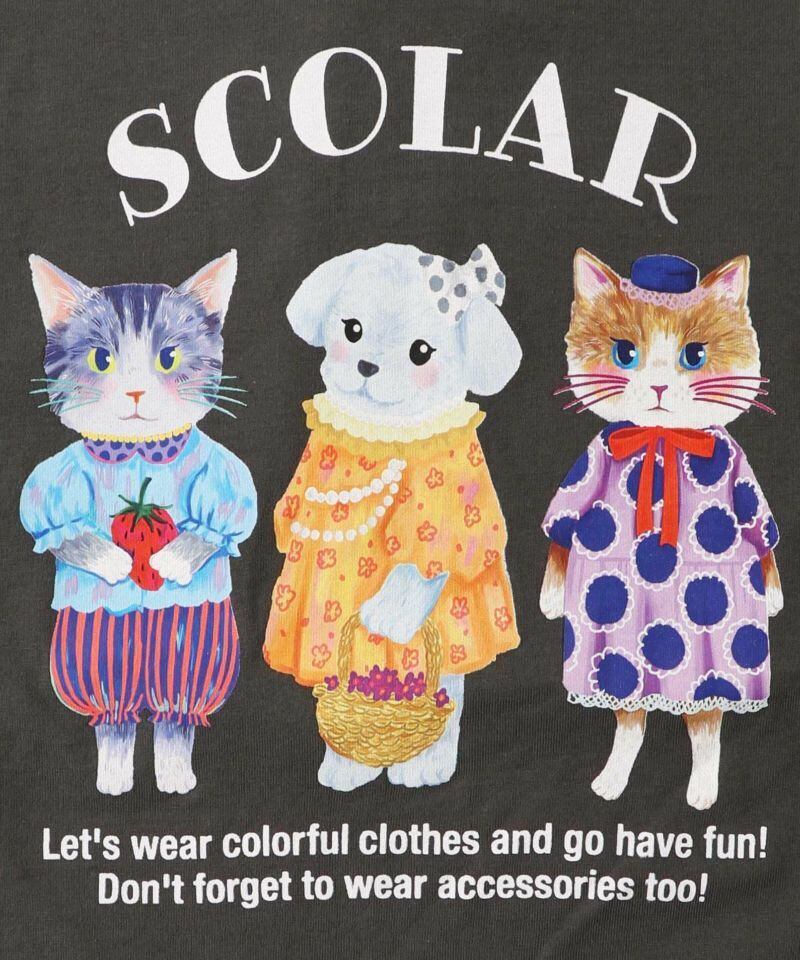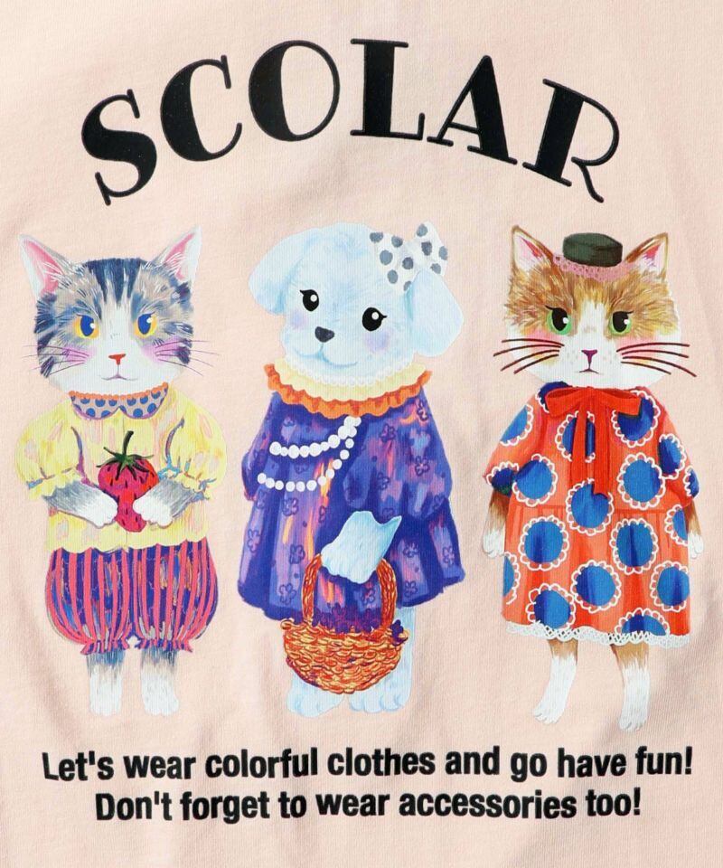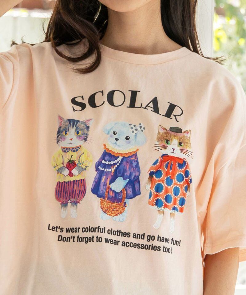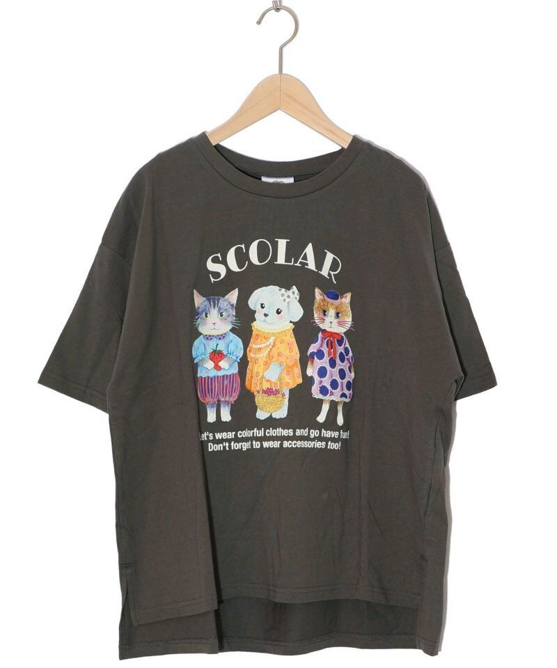 ScoLar(スカラー)おしゃれネコとワンコのアニマル柄Tシャツ オフホワイト、チャコールグレー、ピンク 151680です。