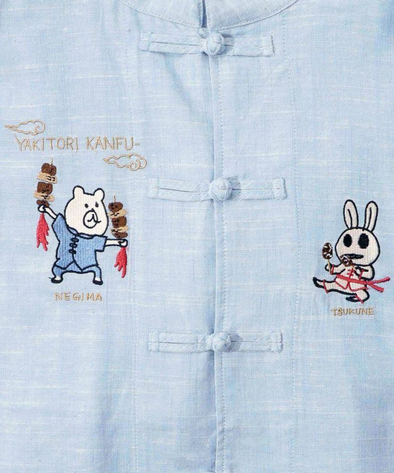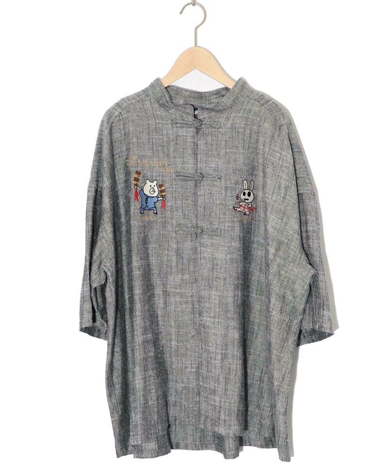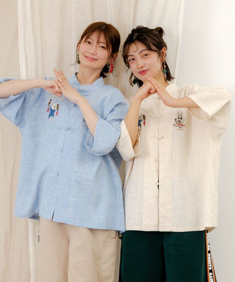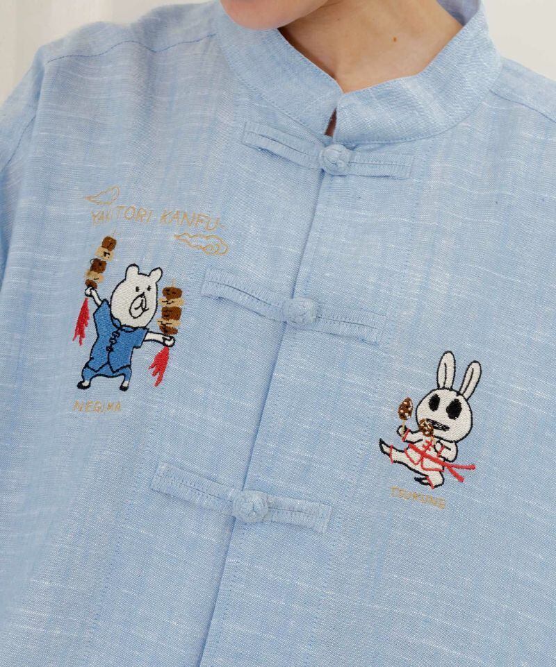 ScoLar Parity(スカラーパリティ)ウサギとクマ刺繍 カンフーチャイナシャツ アイボリー、ブラック、ブルー 352106