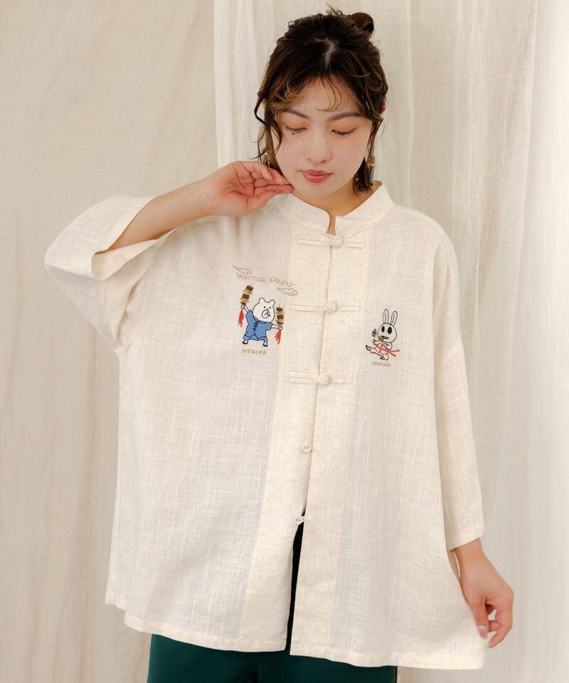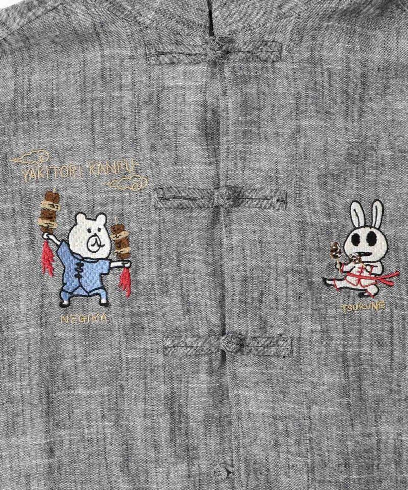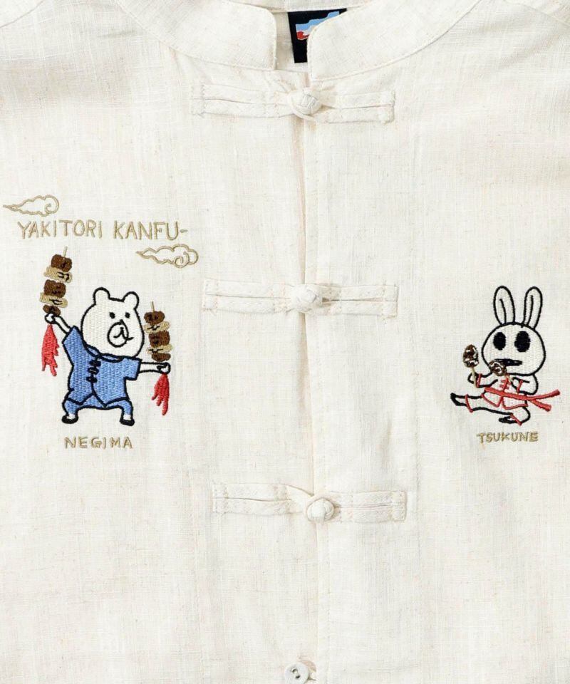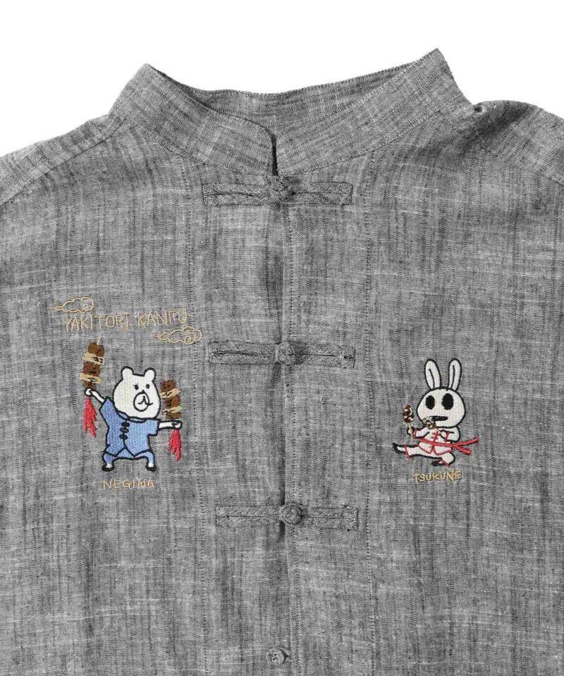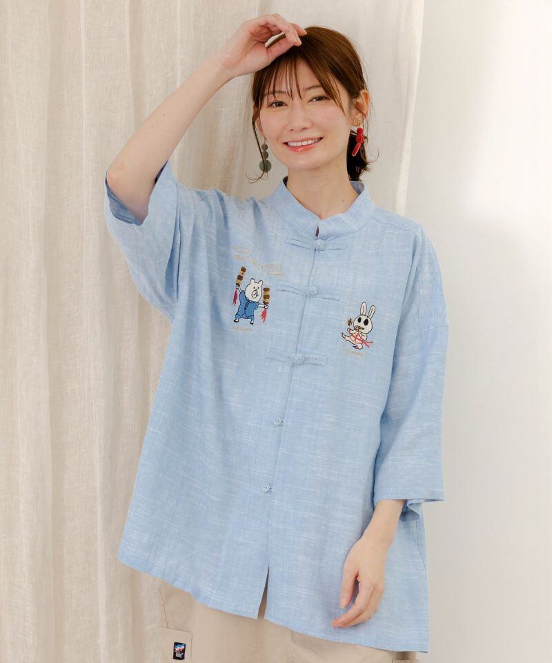 ScoLar Parity(スカラーパリティ)ウサギとクマ刺繍 カンフーチャイナシャツ アイボリー、ブラック、ブルー 352106