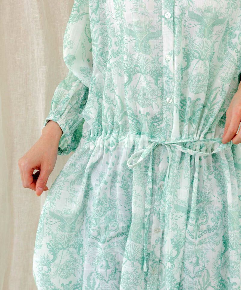 白を基調としたワンピースに、人魚やクジラなど海をイメージしたモチーフを