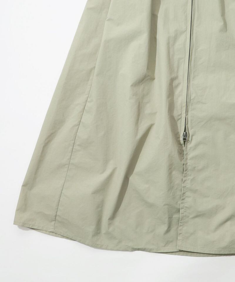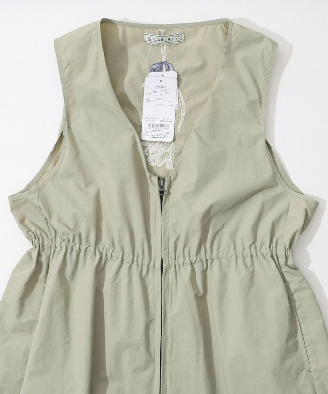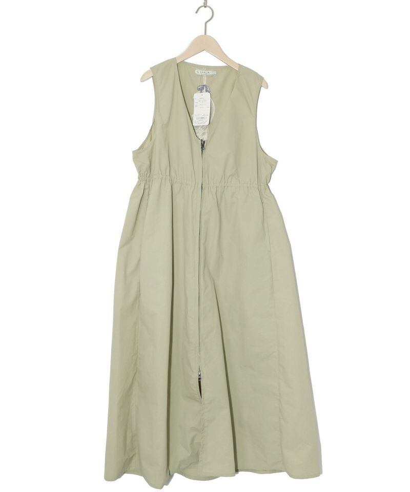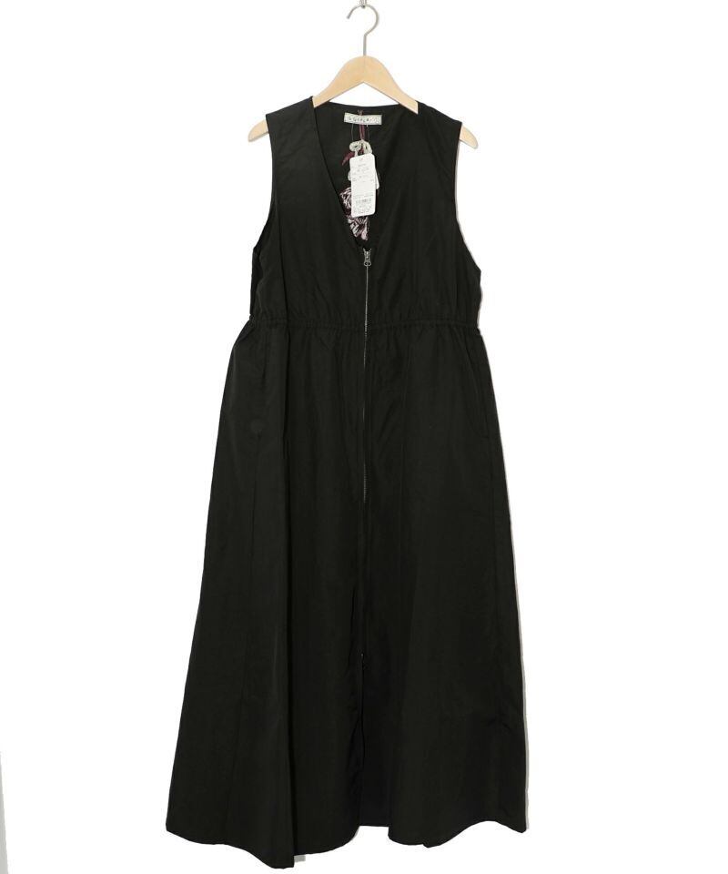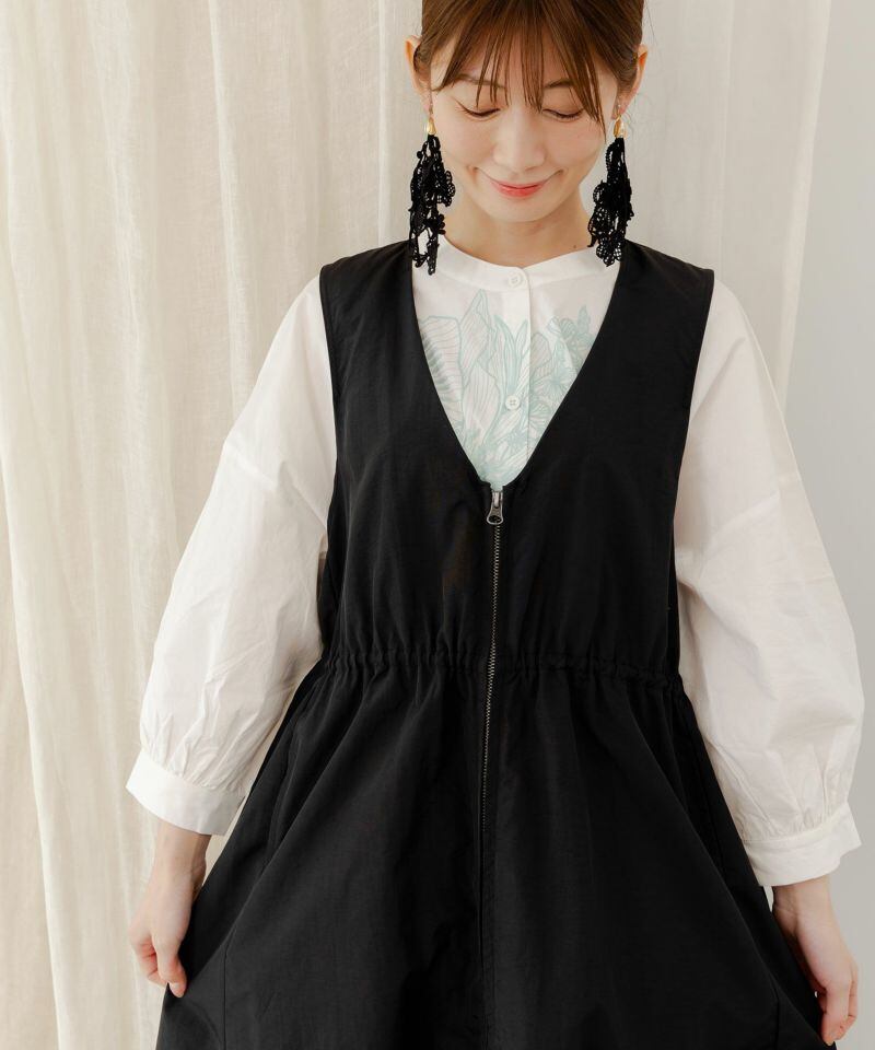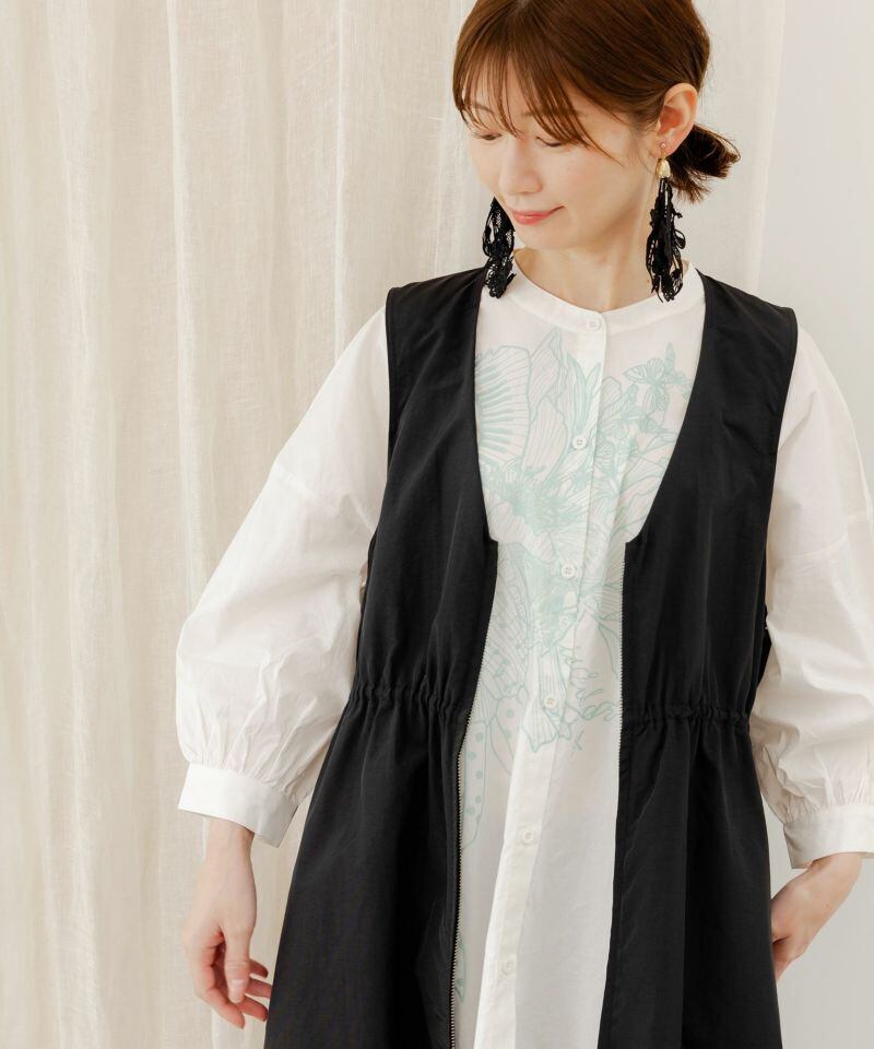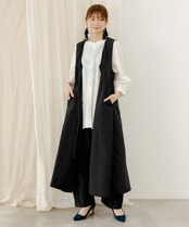 前のファスナーを閉めればワンピースのように着られる、ロング丈ジレ。