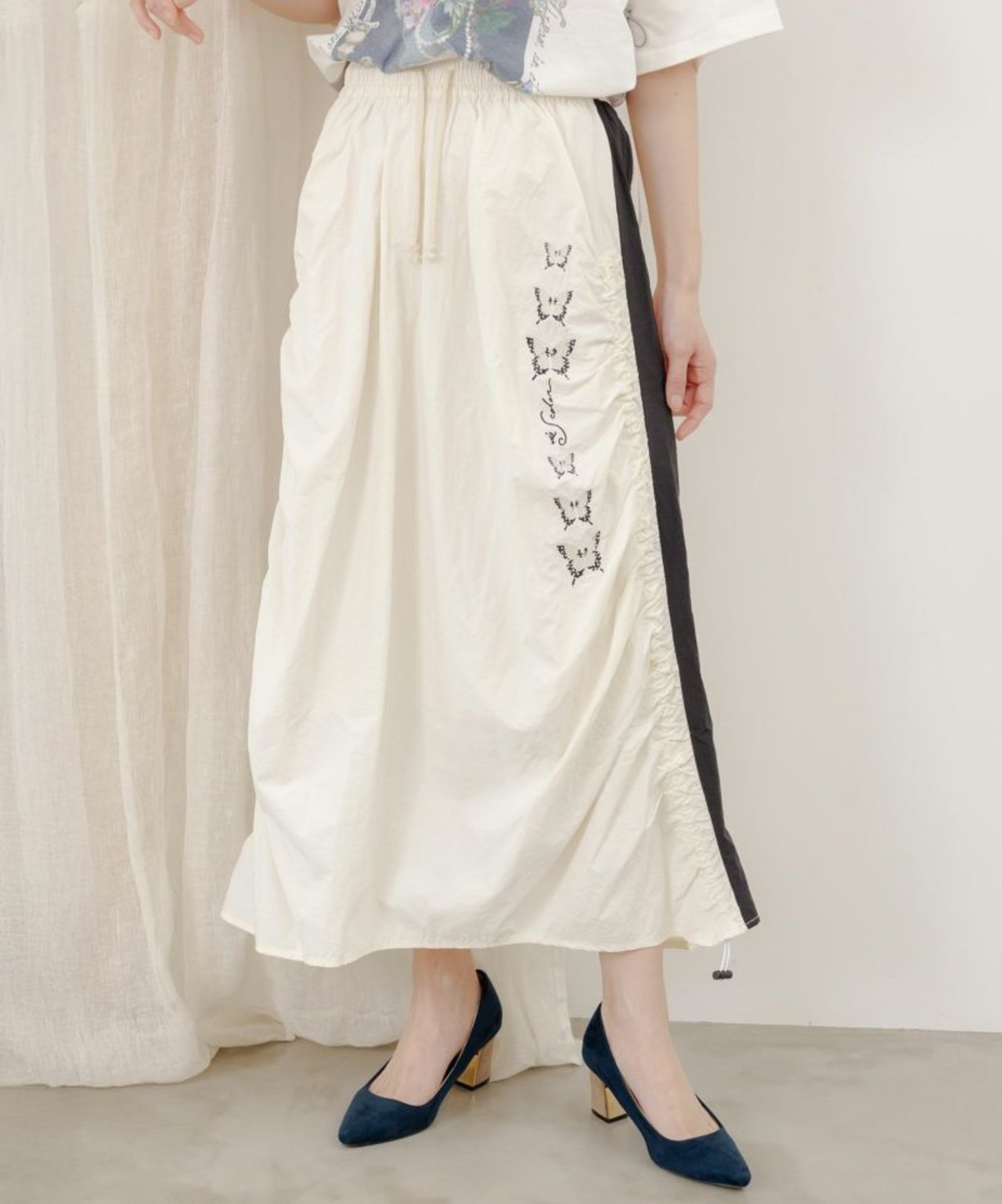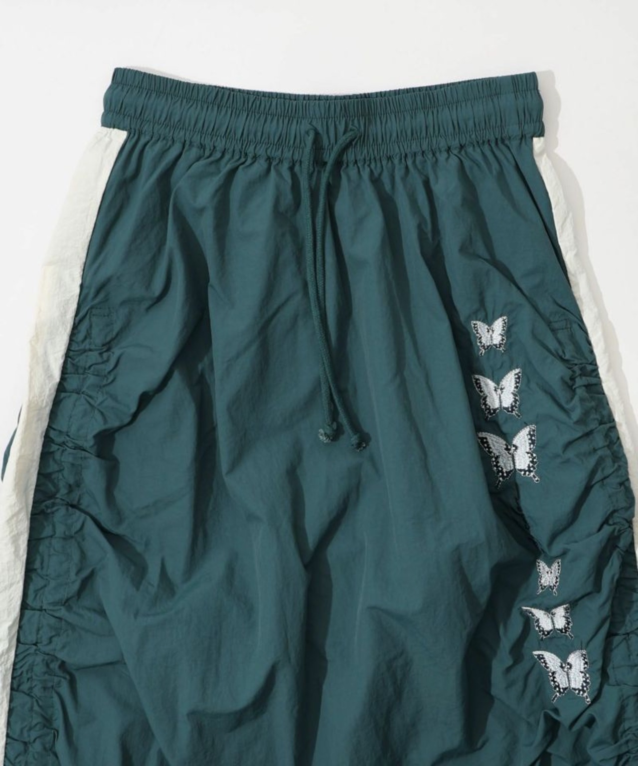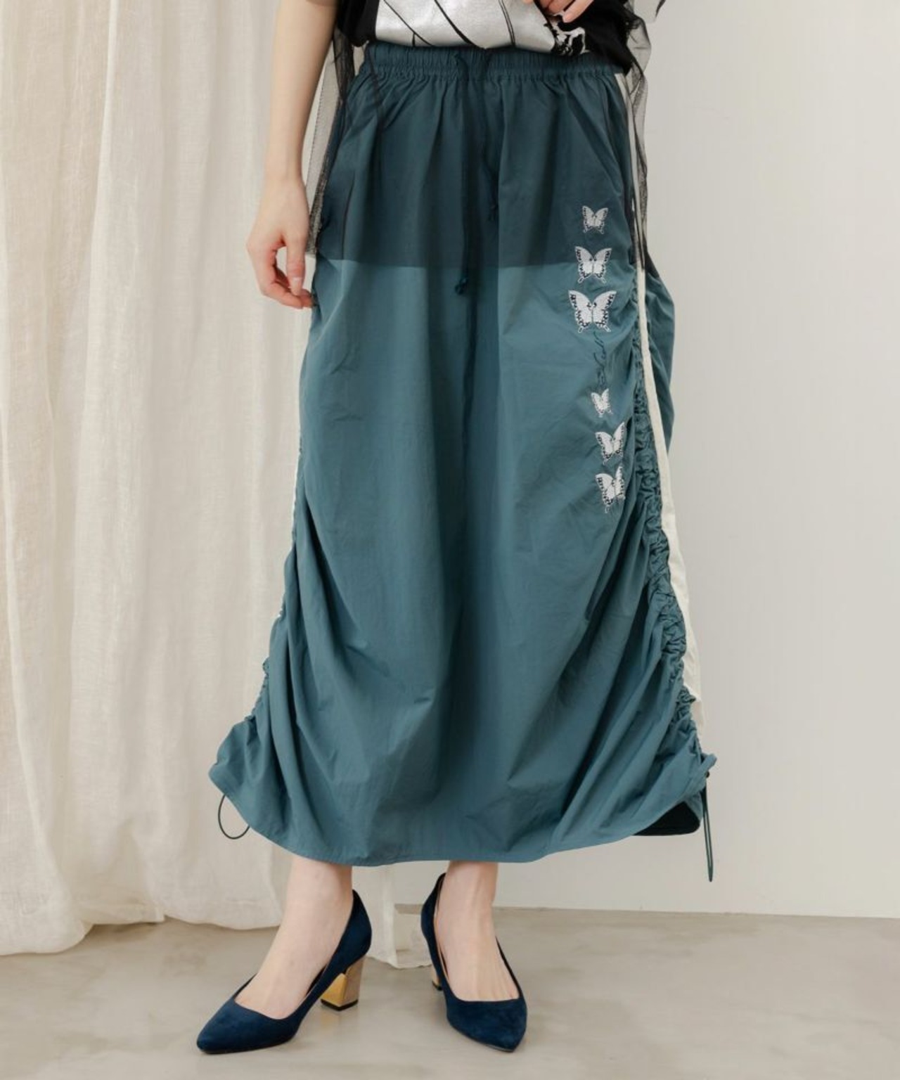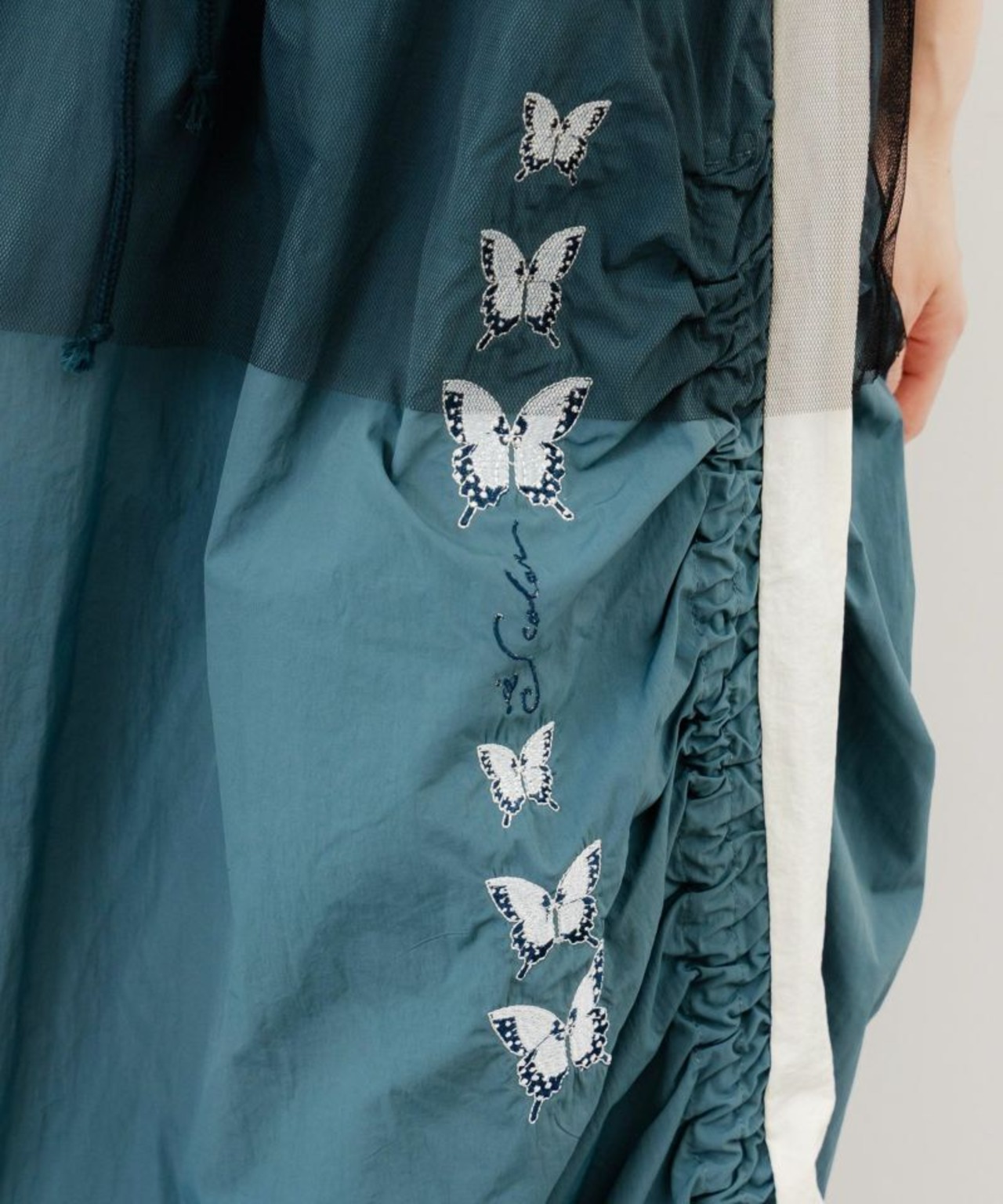サイドにギャザーを寄せ、ラインに沿って蝶柄刺繍をあしらった