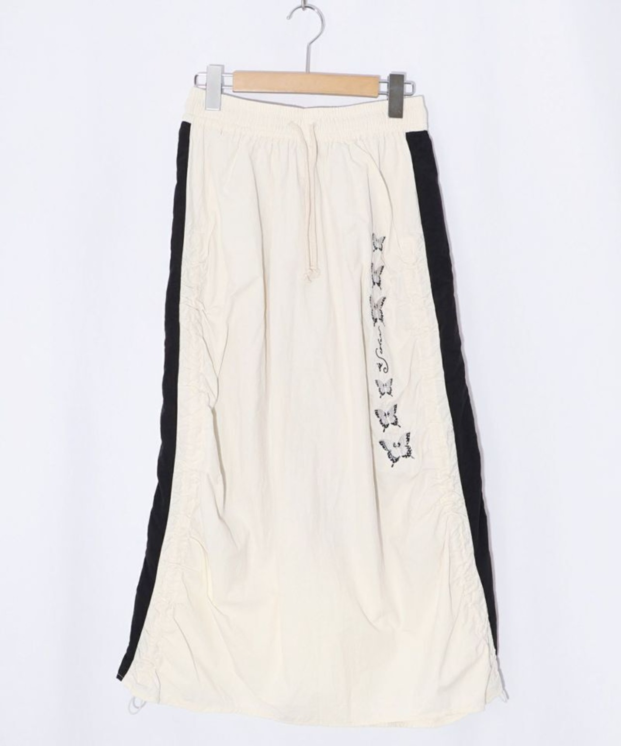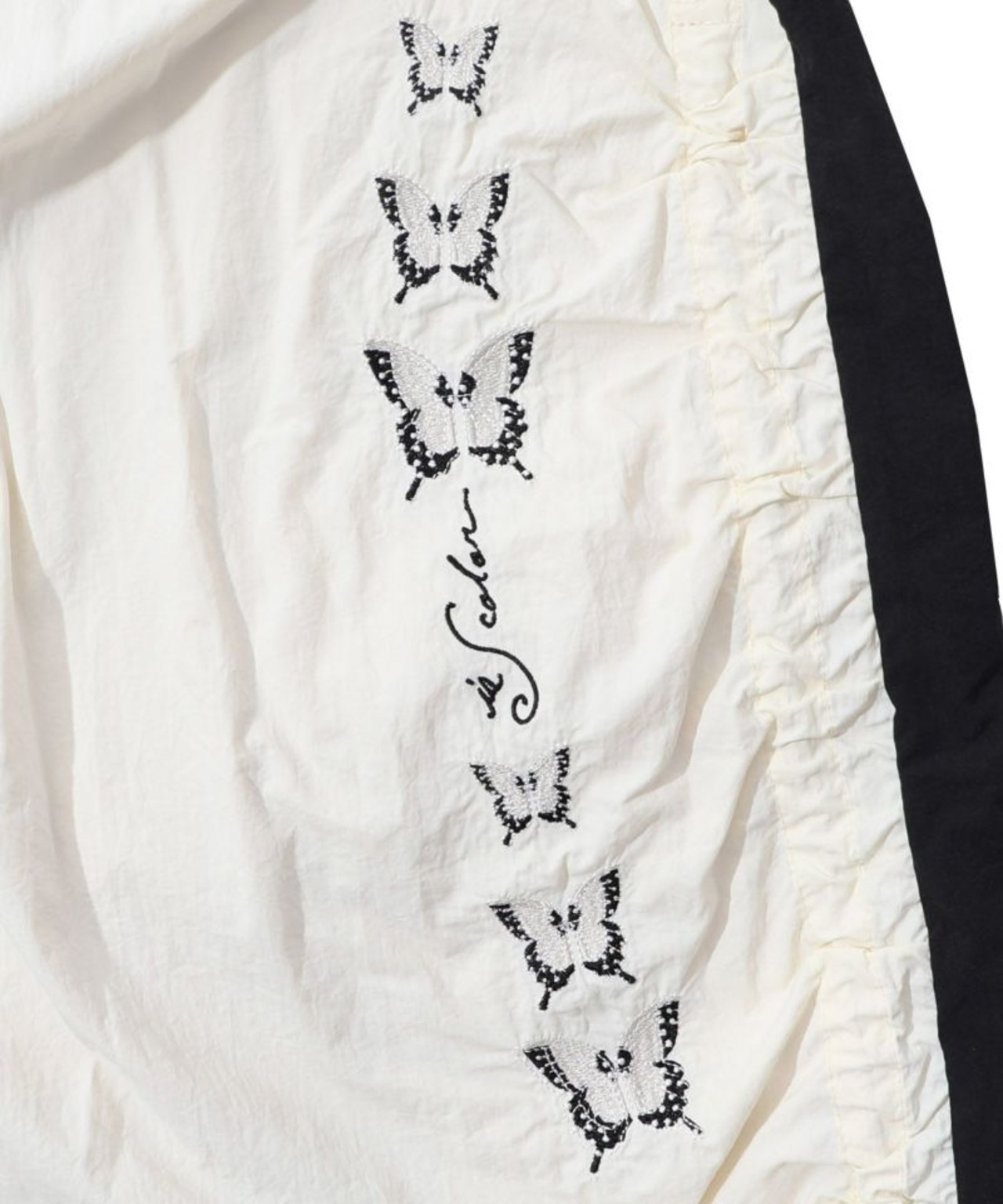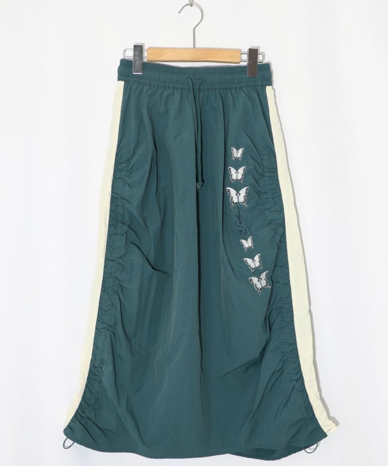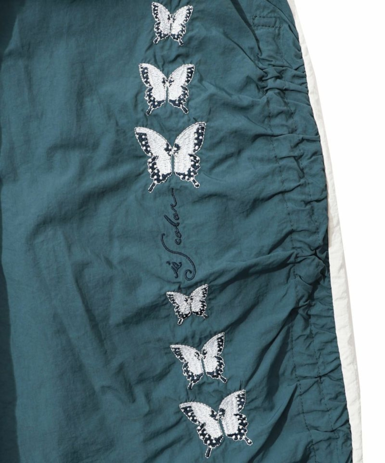 サイドにギャザーを寄せ、ラインに沿って蝶柄刺繍をあしらった
