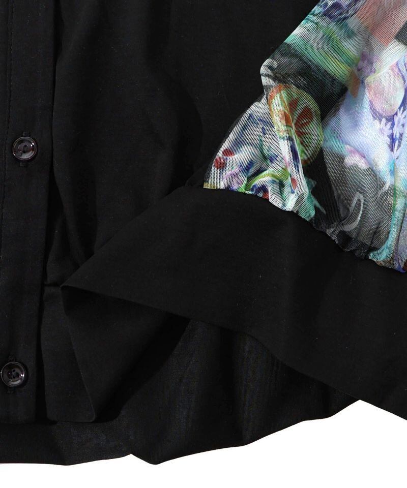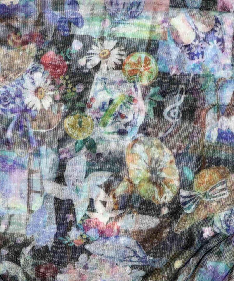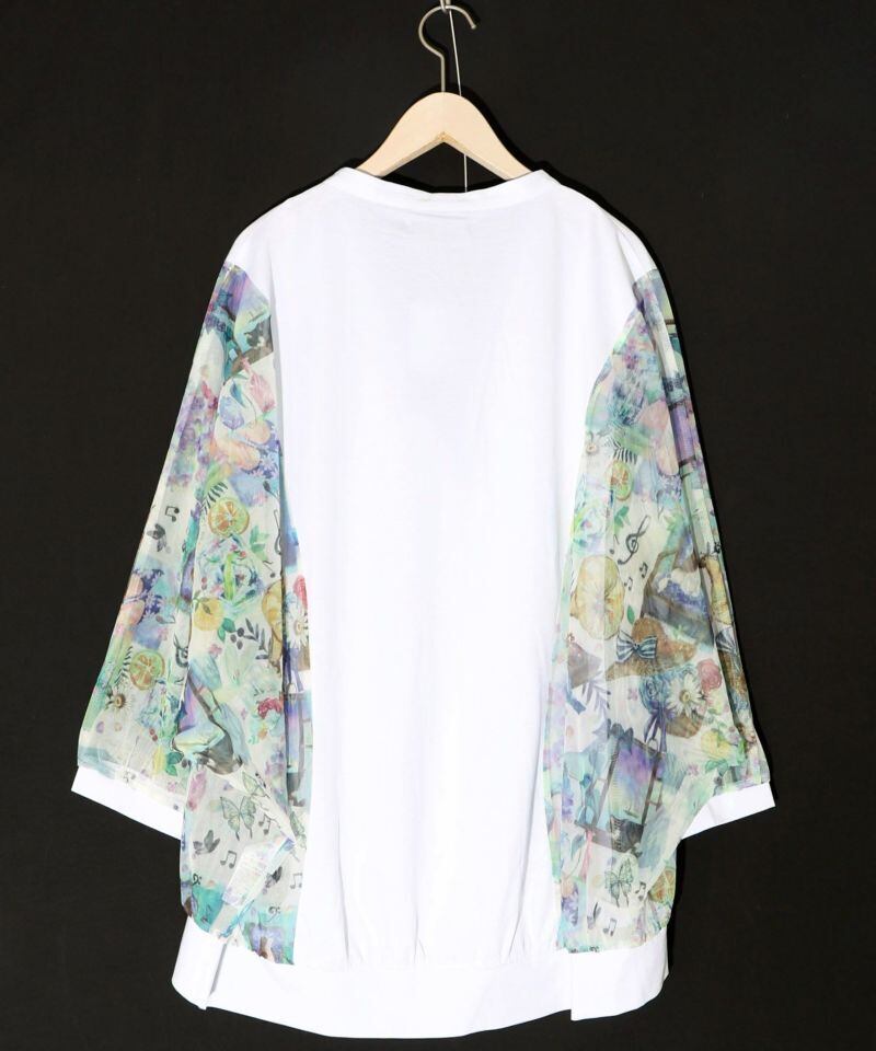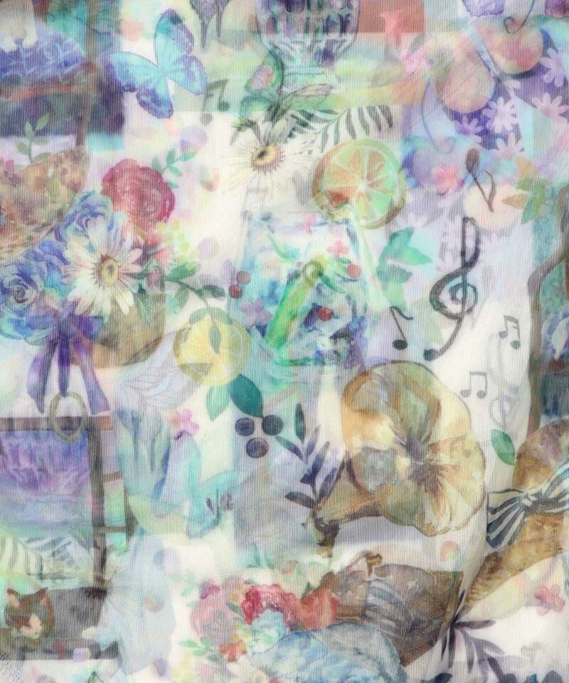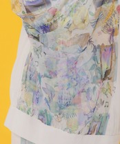 透け感のあるソフトチュールにプリントし、袖から脇にかけて切り替えた