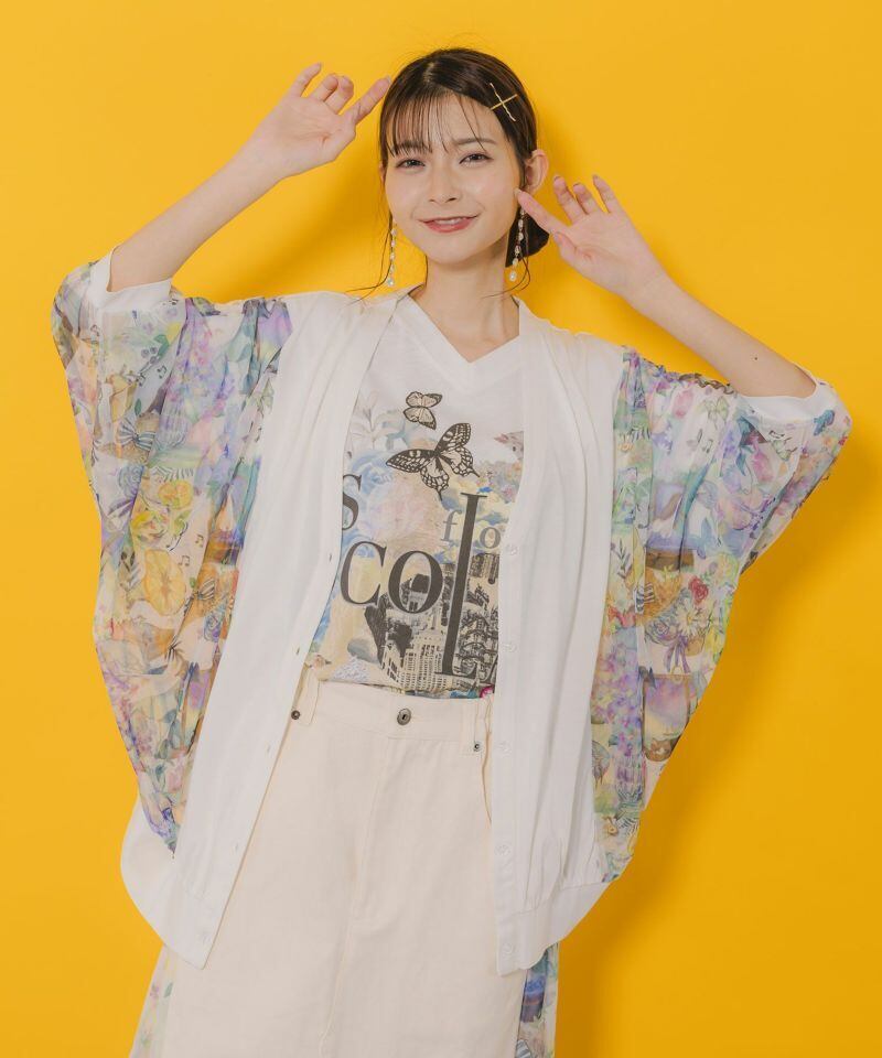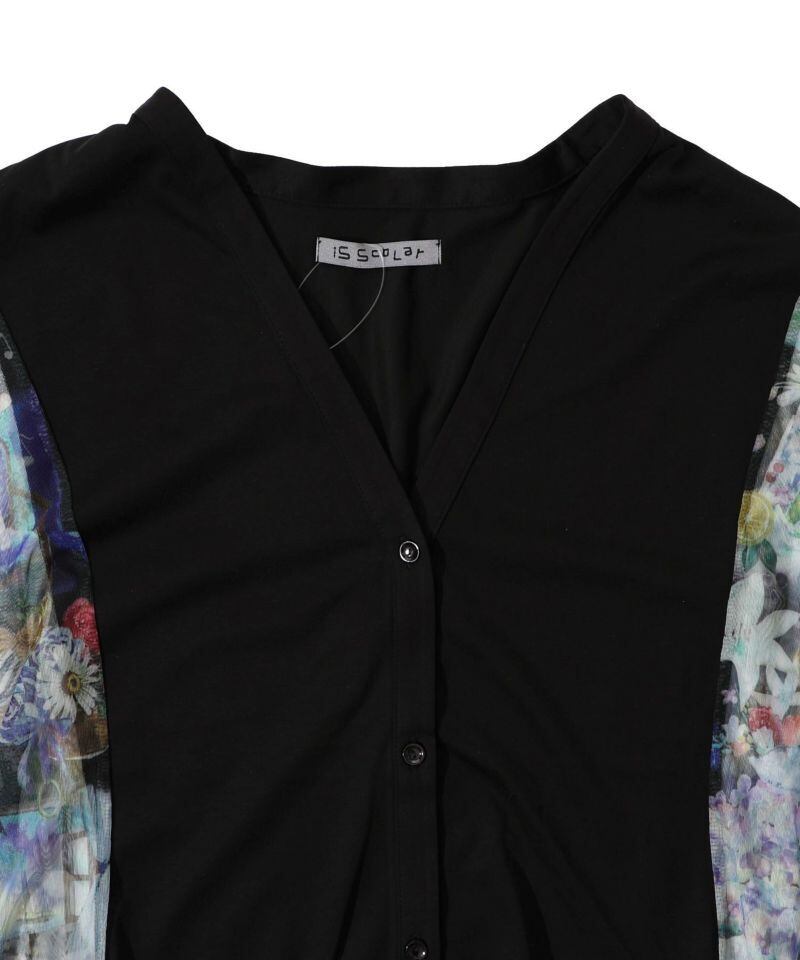ISScoLar(イズスカラー)紫陽花のある海辺のお部屋柄 チュール切替カーディガン オフホワイト、ブラック 552227 です。