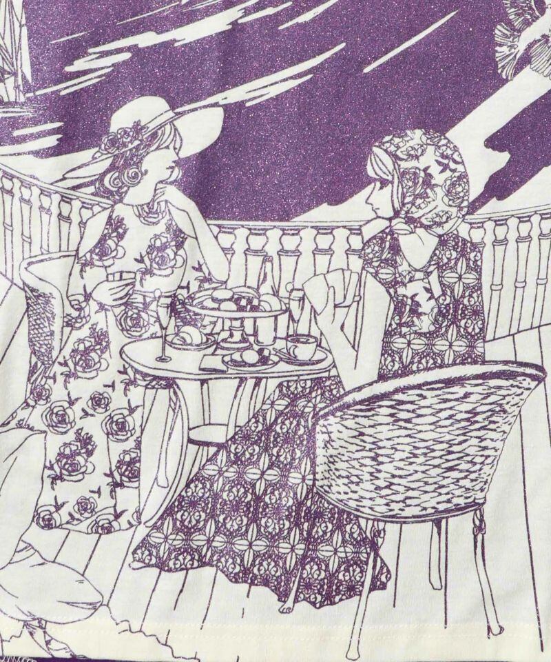 海辺で女の子たちが楽しげにティータイムを楽しむ、涼しげな柄のプルオーバー。