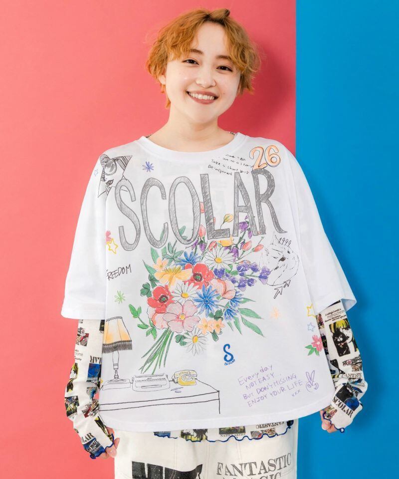 スカラーらしいにぎやかなプリントがポイントのプルオーバー。