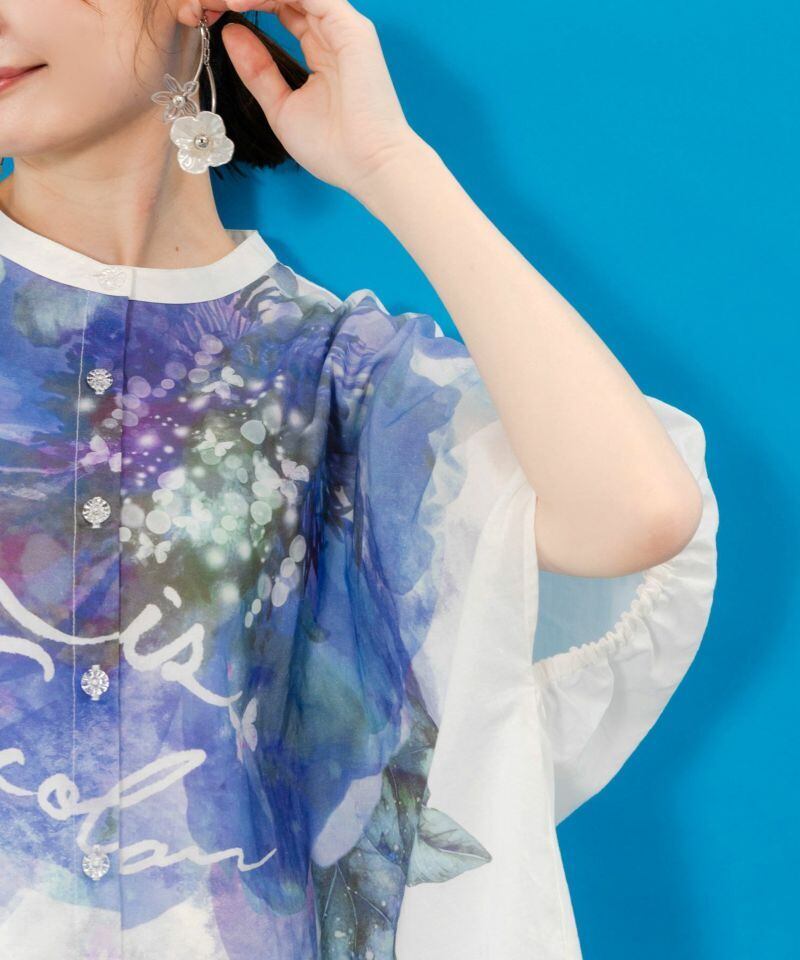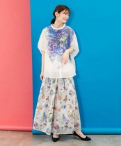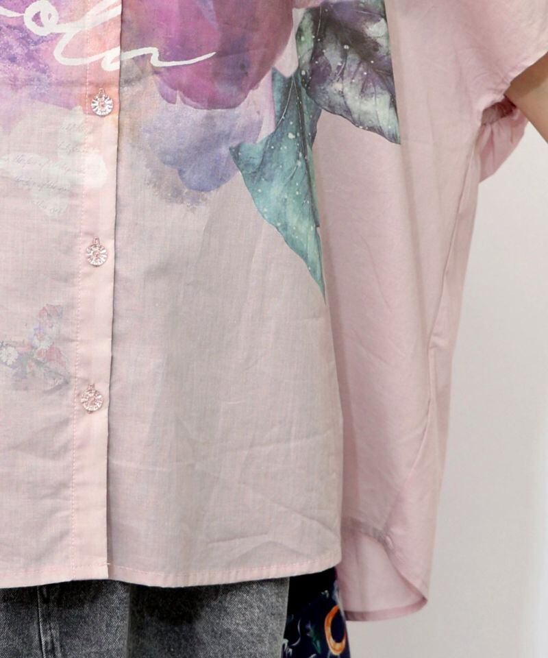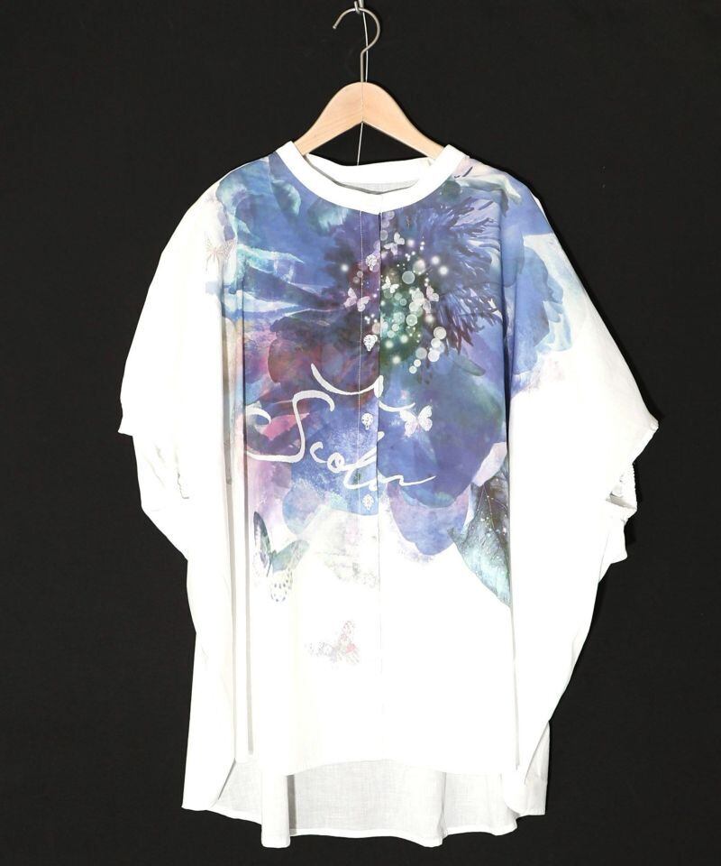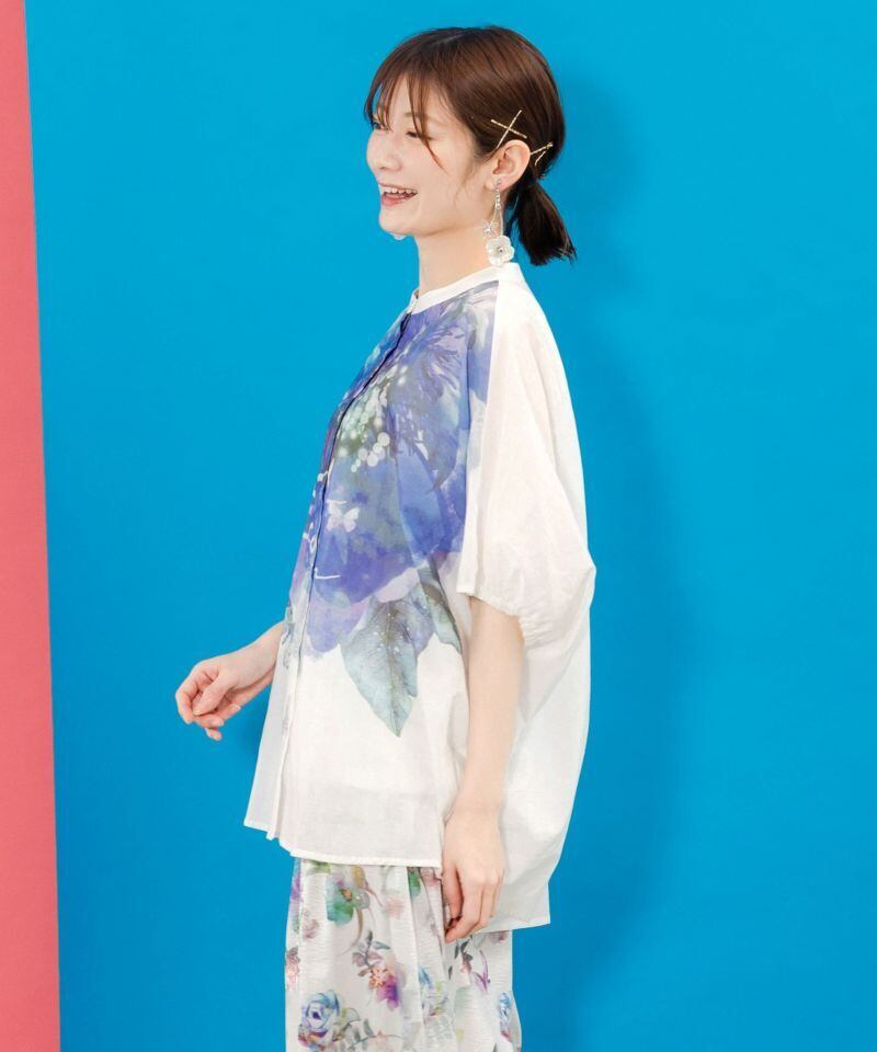 胸元に大きな水彩タッチのお花が咲いたパッと目を惹く主役級プリントシャツ。
