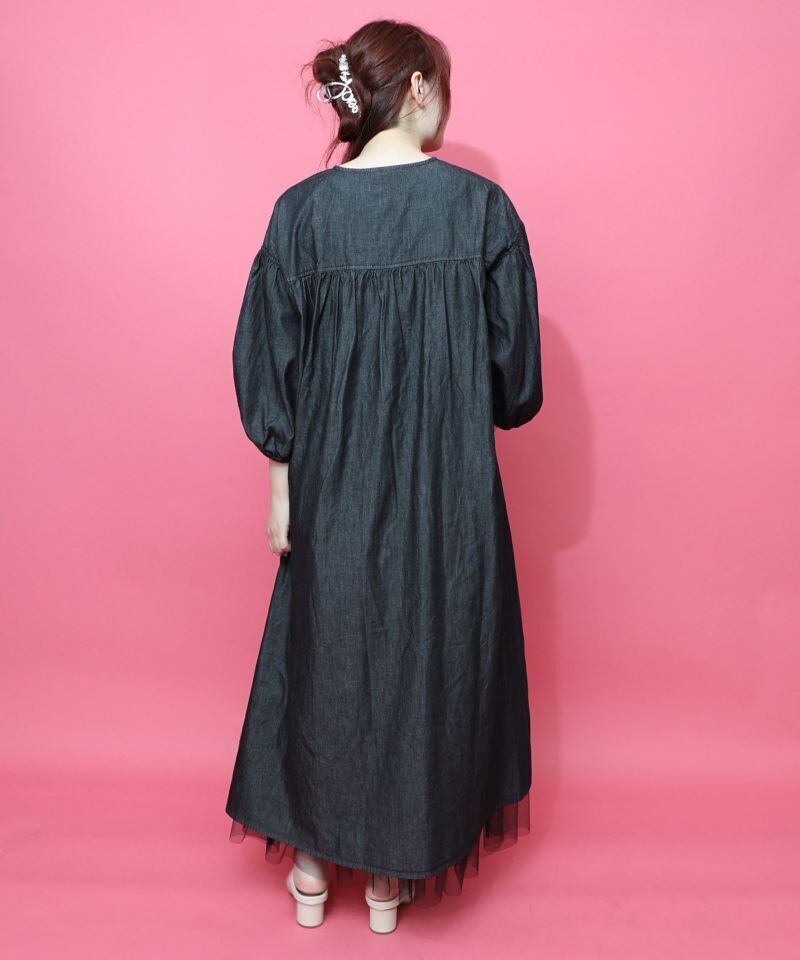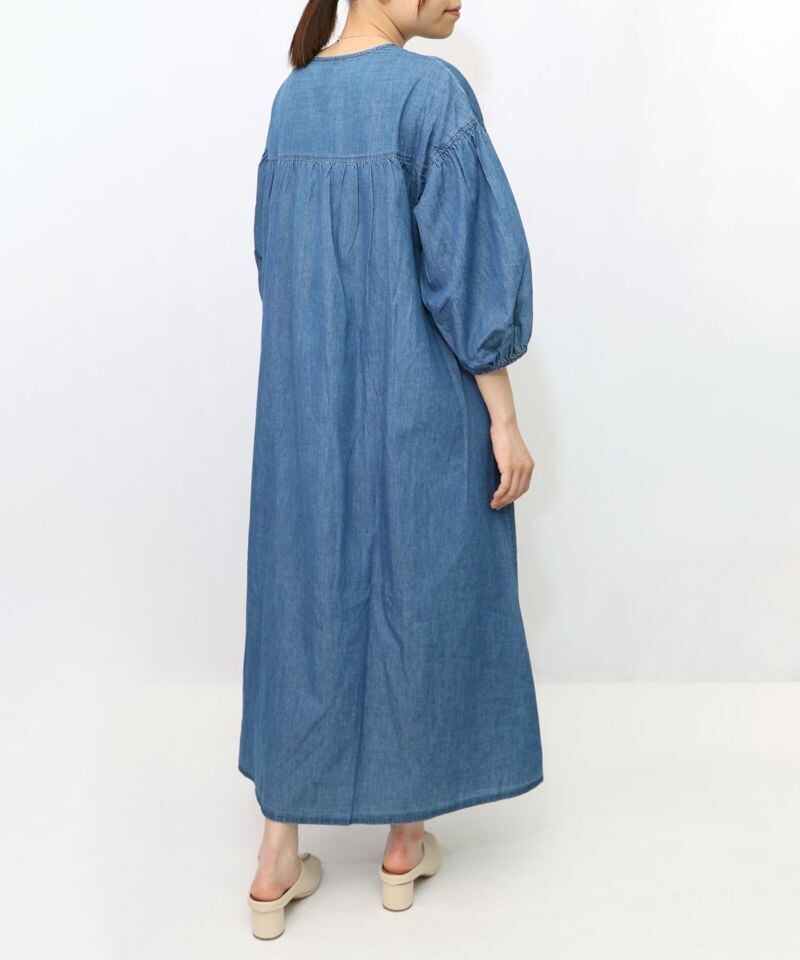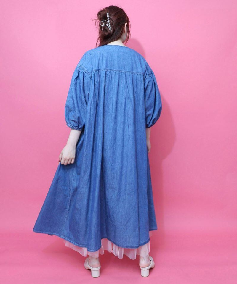 ふんわり広がった袖とゆったりシルエットのスカートが可愛らしいデニムシャツワンピ。