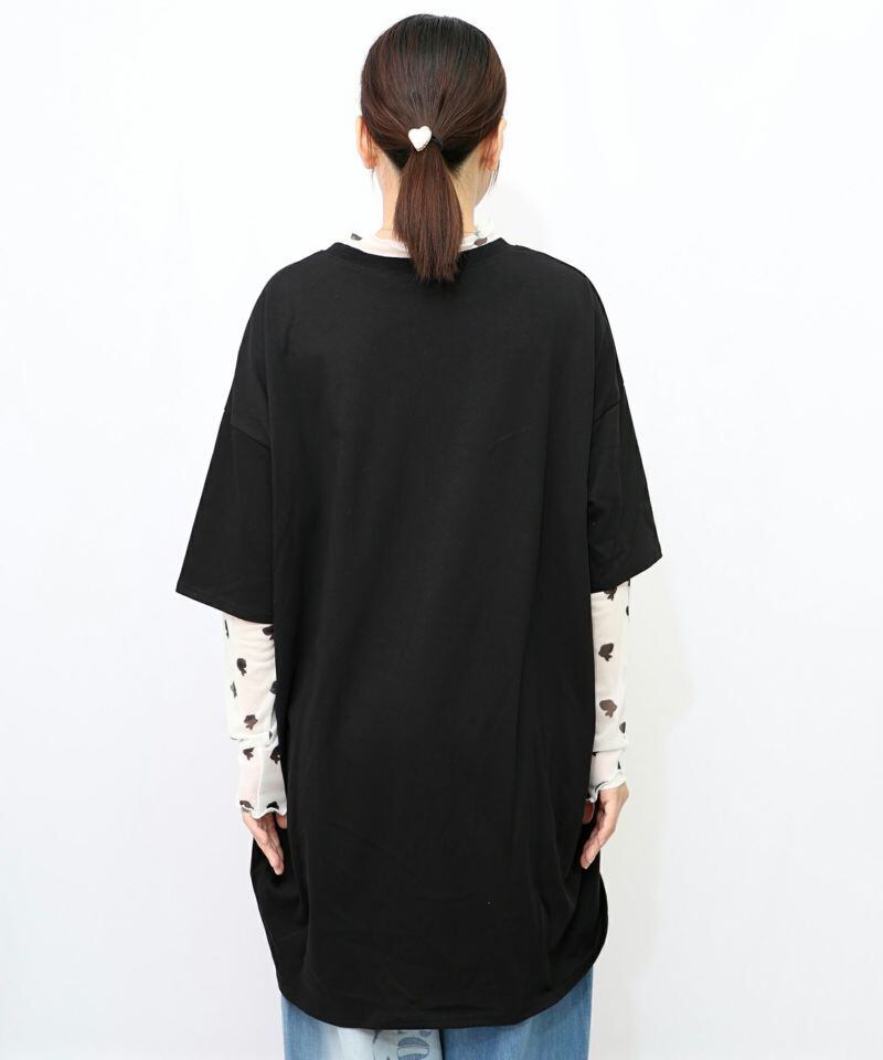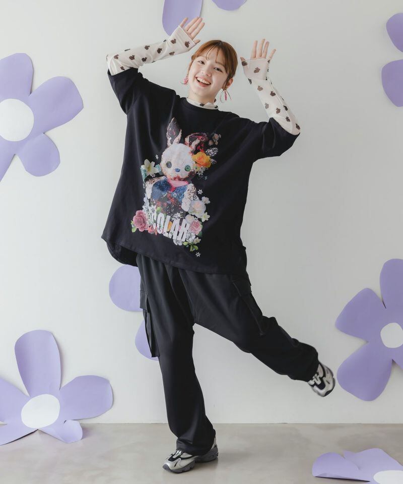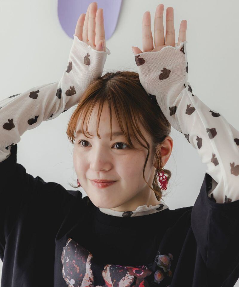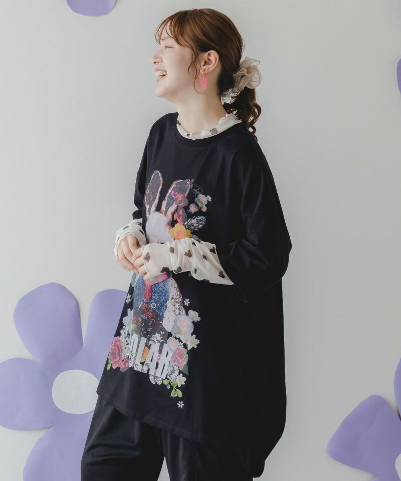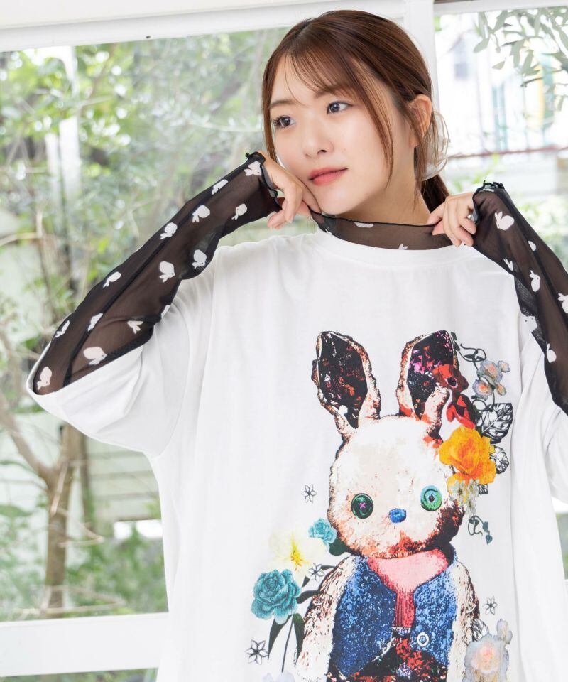 ロックなコーデにも合いそうな、ちょっぴりダークなウサギのぬいぐるみ柄チュニック。