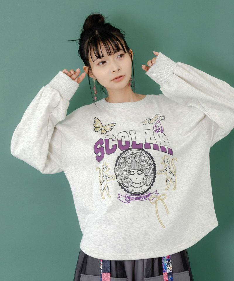ScoLar(スカラー)スカラーちゃん×トラ×蝶刺繍 ミニ裏毛プルオーバー 杢グレー、ブラック、グリーン 153698