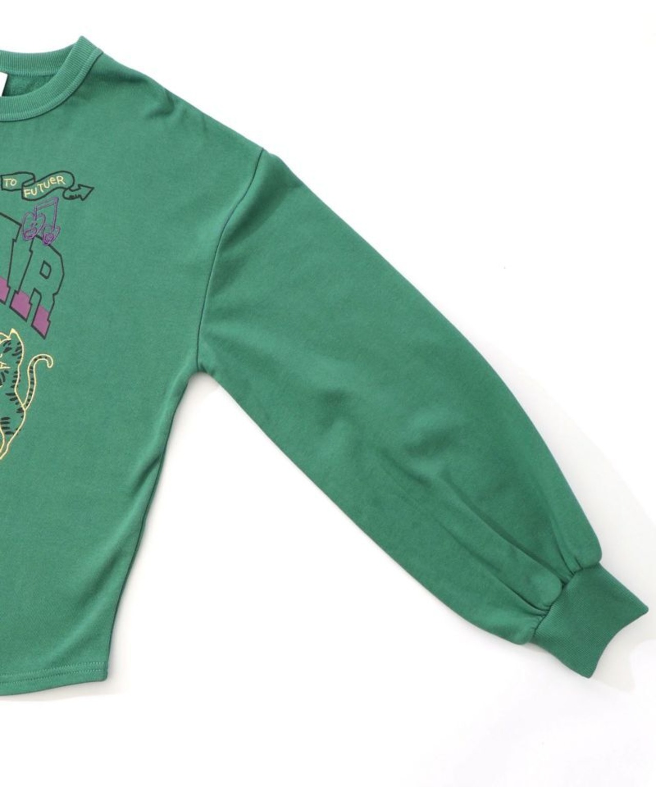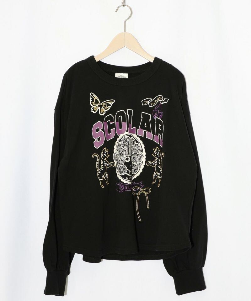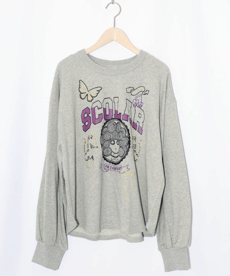 ScoLar(スカラー)スカラーちゃん×トラ×蝶刺繍 ミニ裏毛プルオーバー 杢グレー、ブラック、グリーン 153698 です。