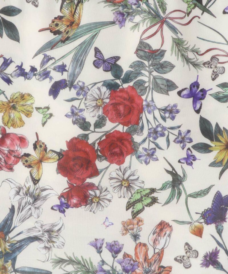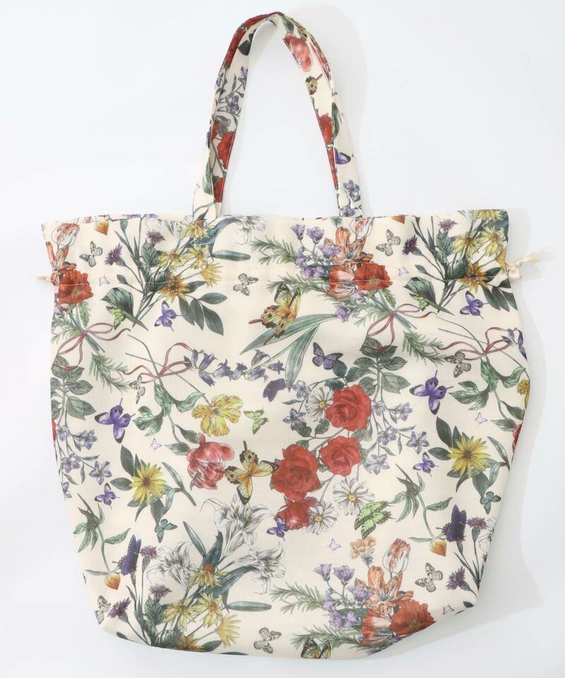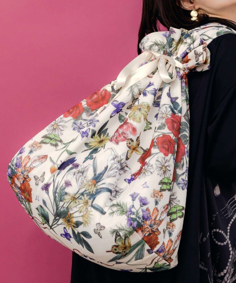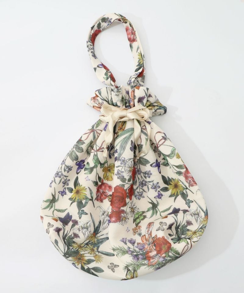 モチっとしたほどよい弾力のある生地を使用した、花柄総柄巾着バッグ。