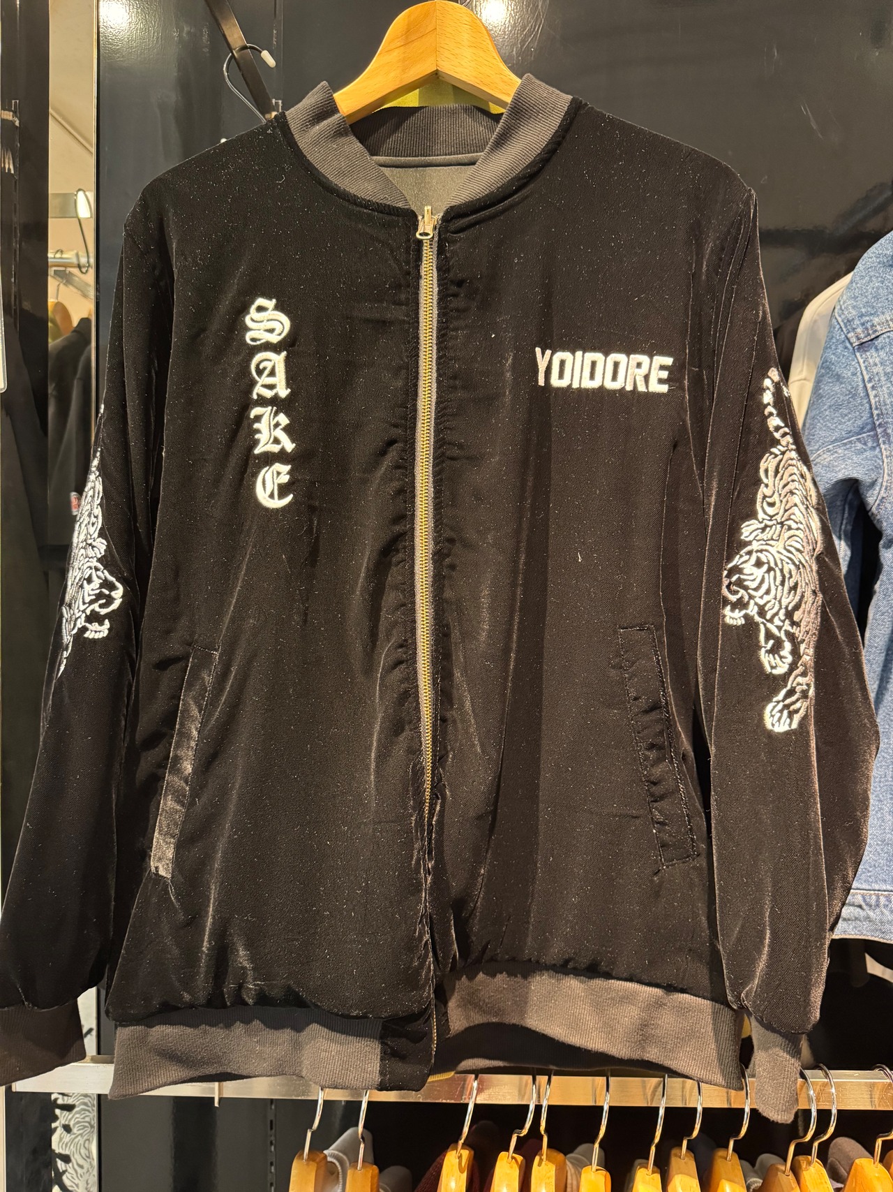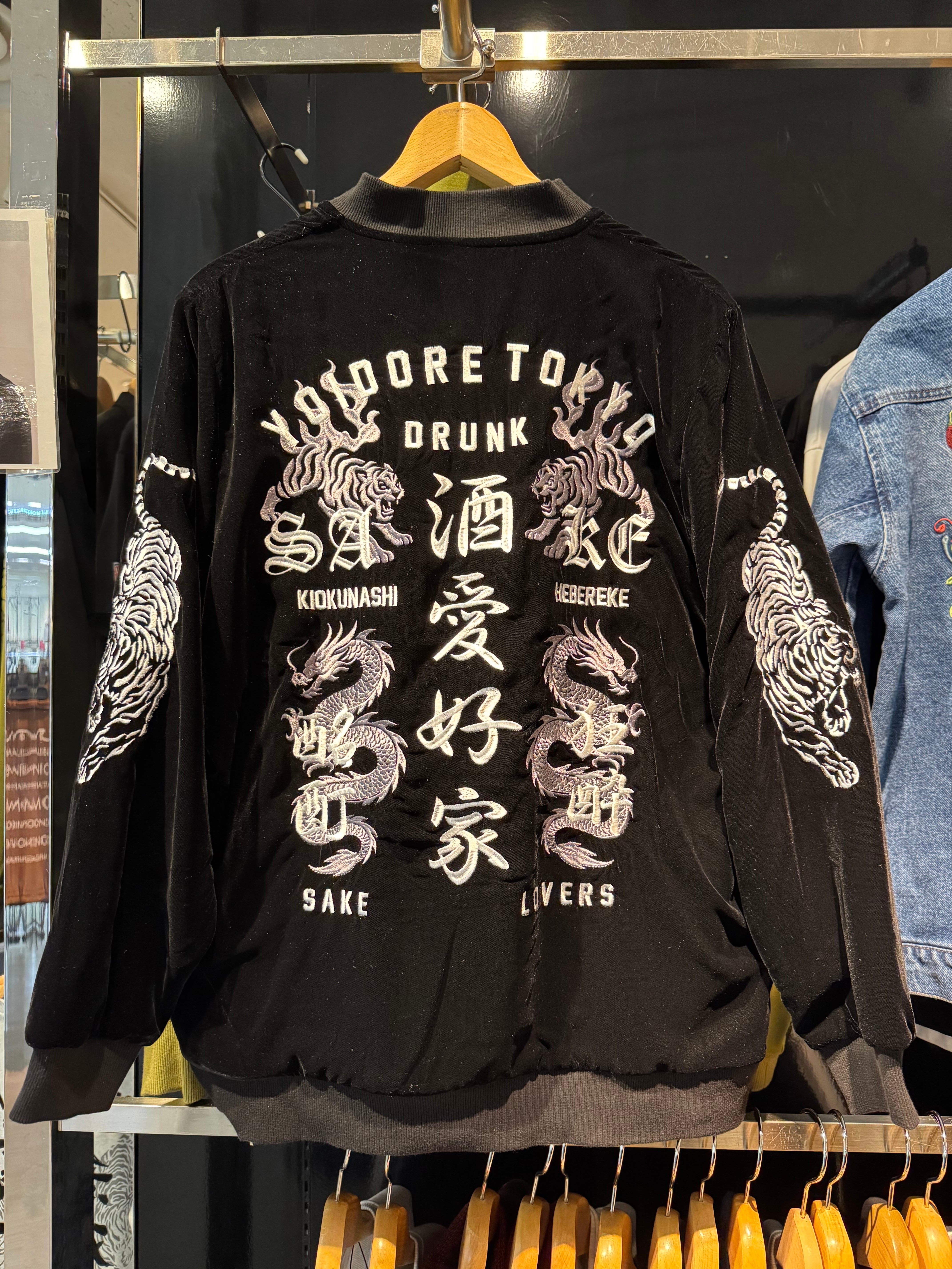 背中には虎、龍、酒愛好家等の刺繍が入っています。