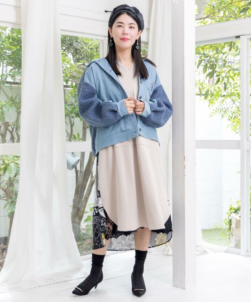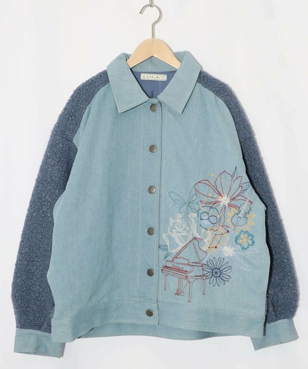 IS ScoLar(イズスカラー)花蝶刺繍デニム×プードルボア 切替ジャケット ブラック、サックス、ネイビー 553250 です。