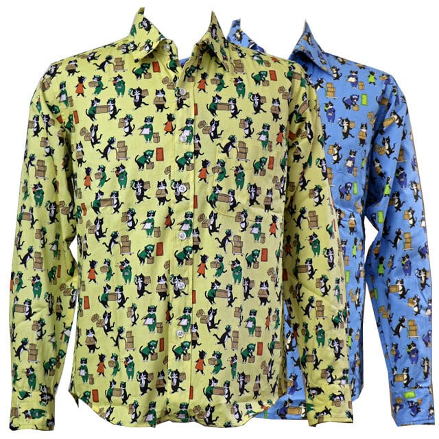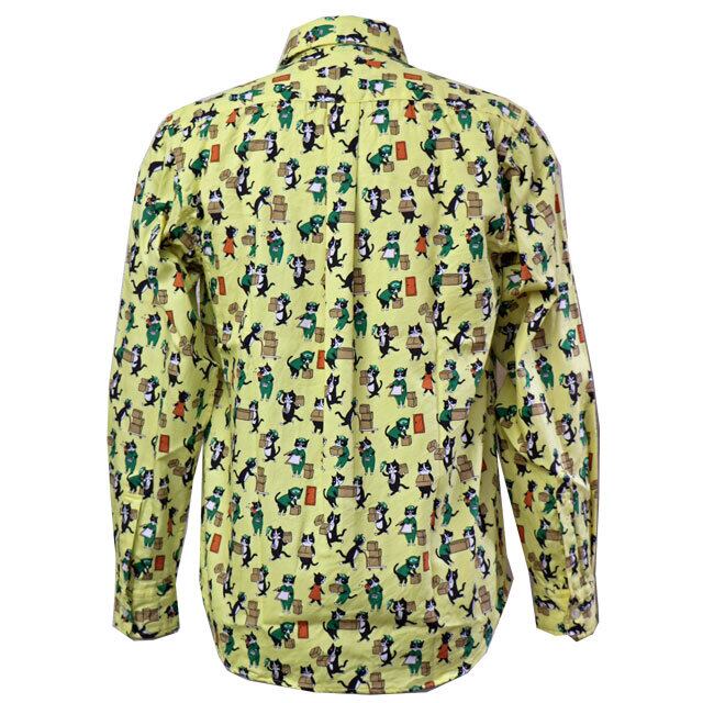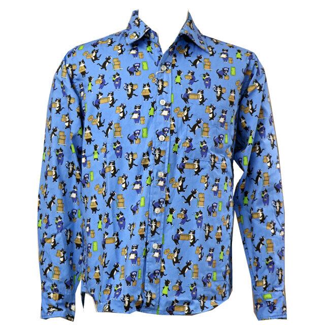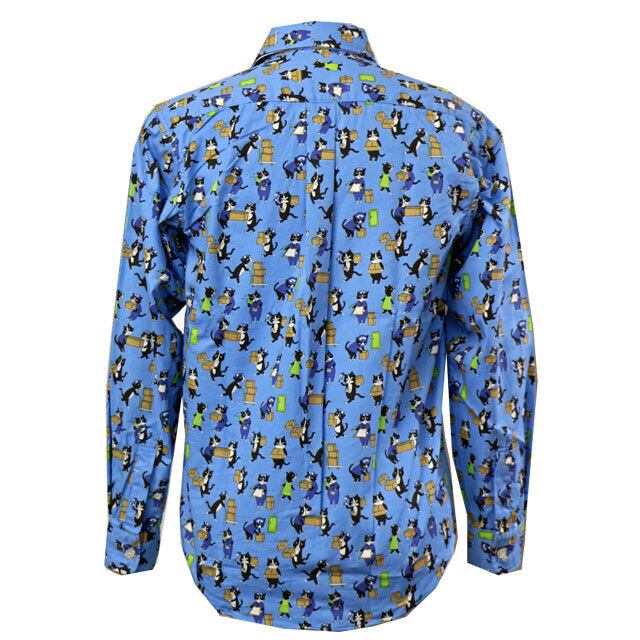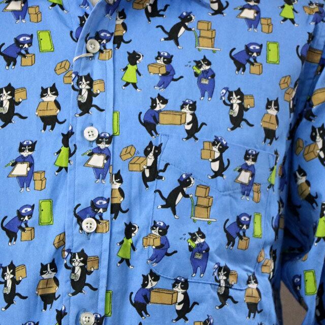 猫が配達等で働いているイラストがシャツ一杯にプリントされています。