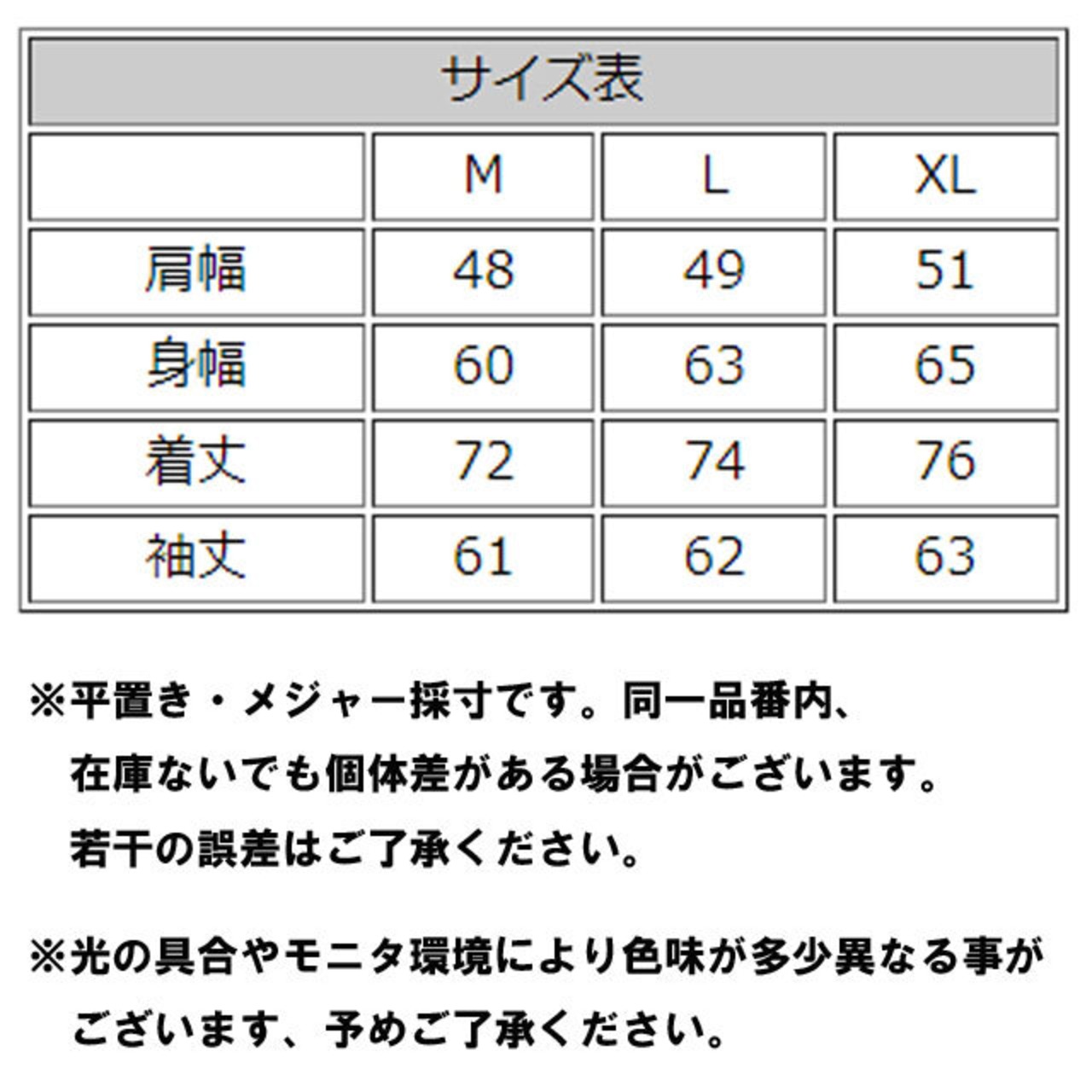 M:肩幅48 身幅60 着丈72 袖丈61