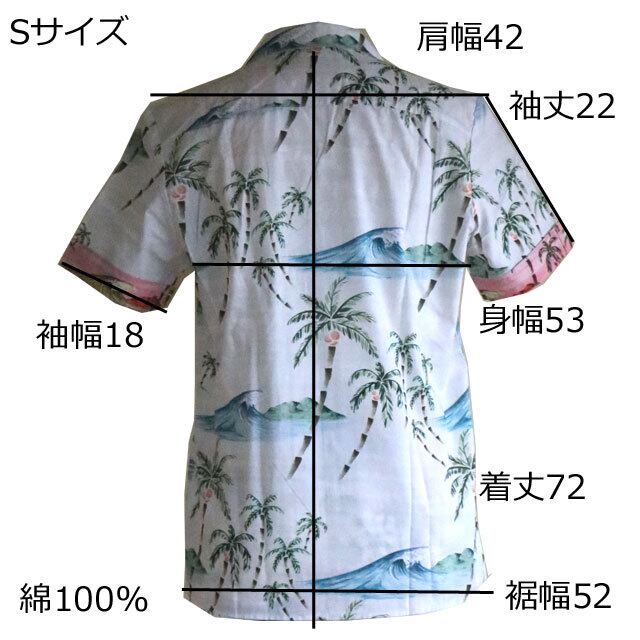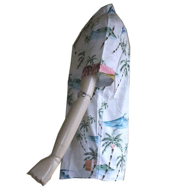 南国の雰囲気満点ヤシの木や波等が描かれているプリントシャツです。