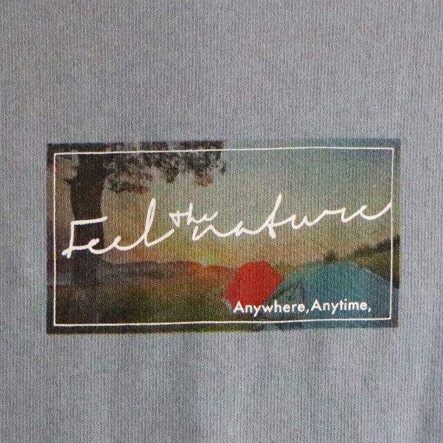 胸部分にテントのフォトプリントの上に筆記体のロゴとAnywhere,Anytimeのプリント