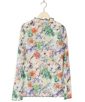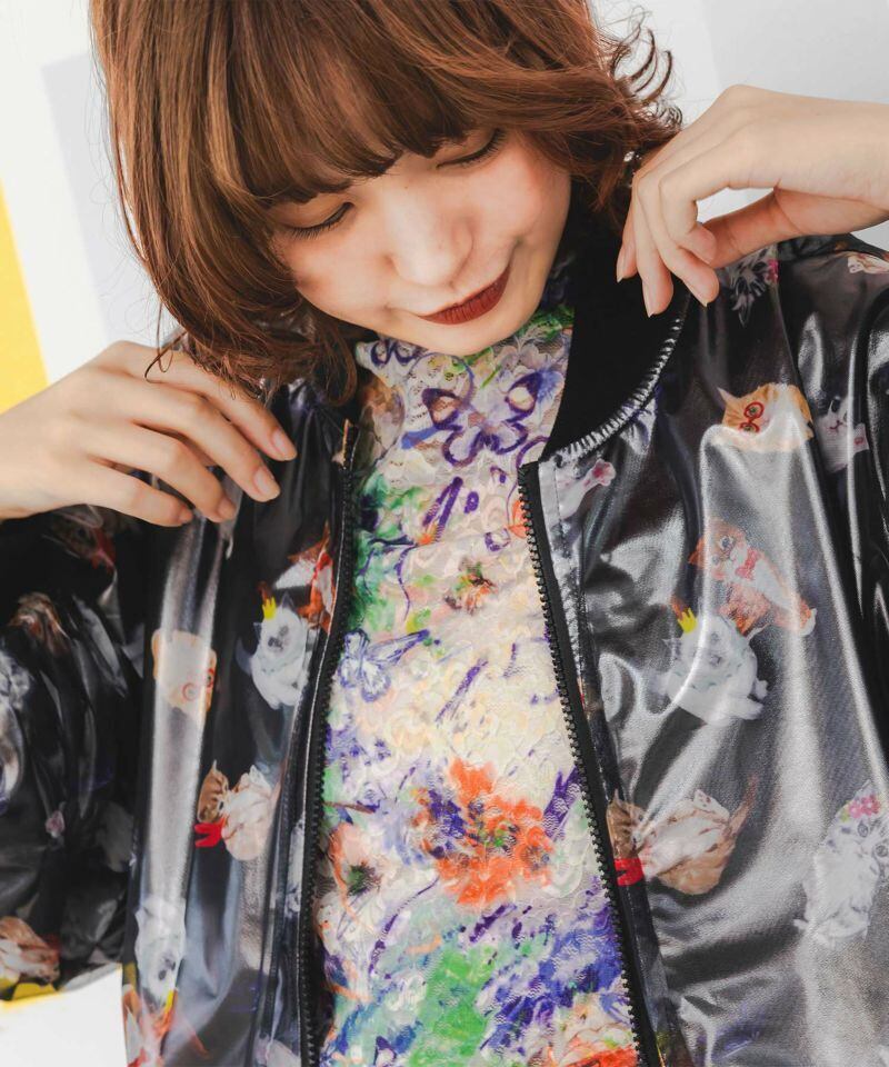 鮮やかな総柄プリントがコーデに彩りをプラスしてくれ、気になる首周りもさりげなくカバー。