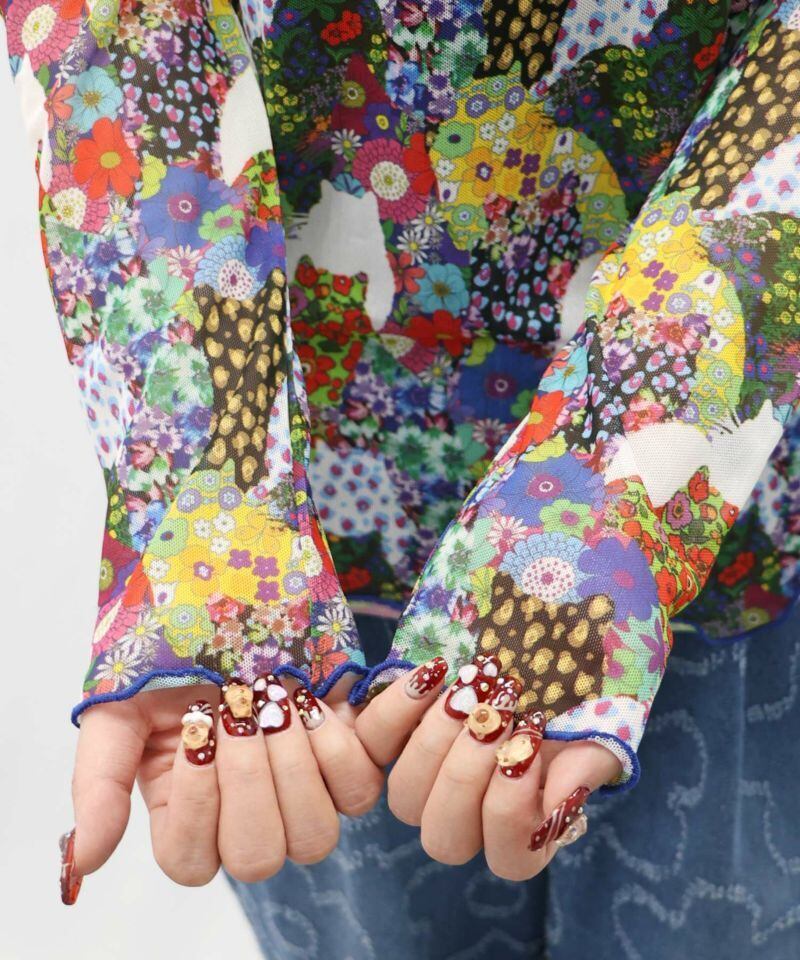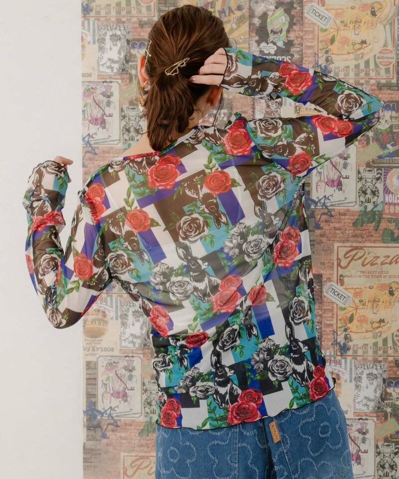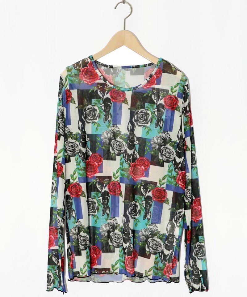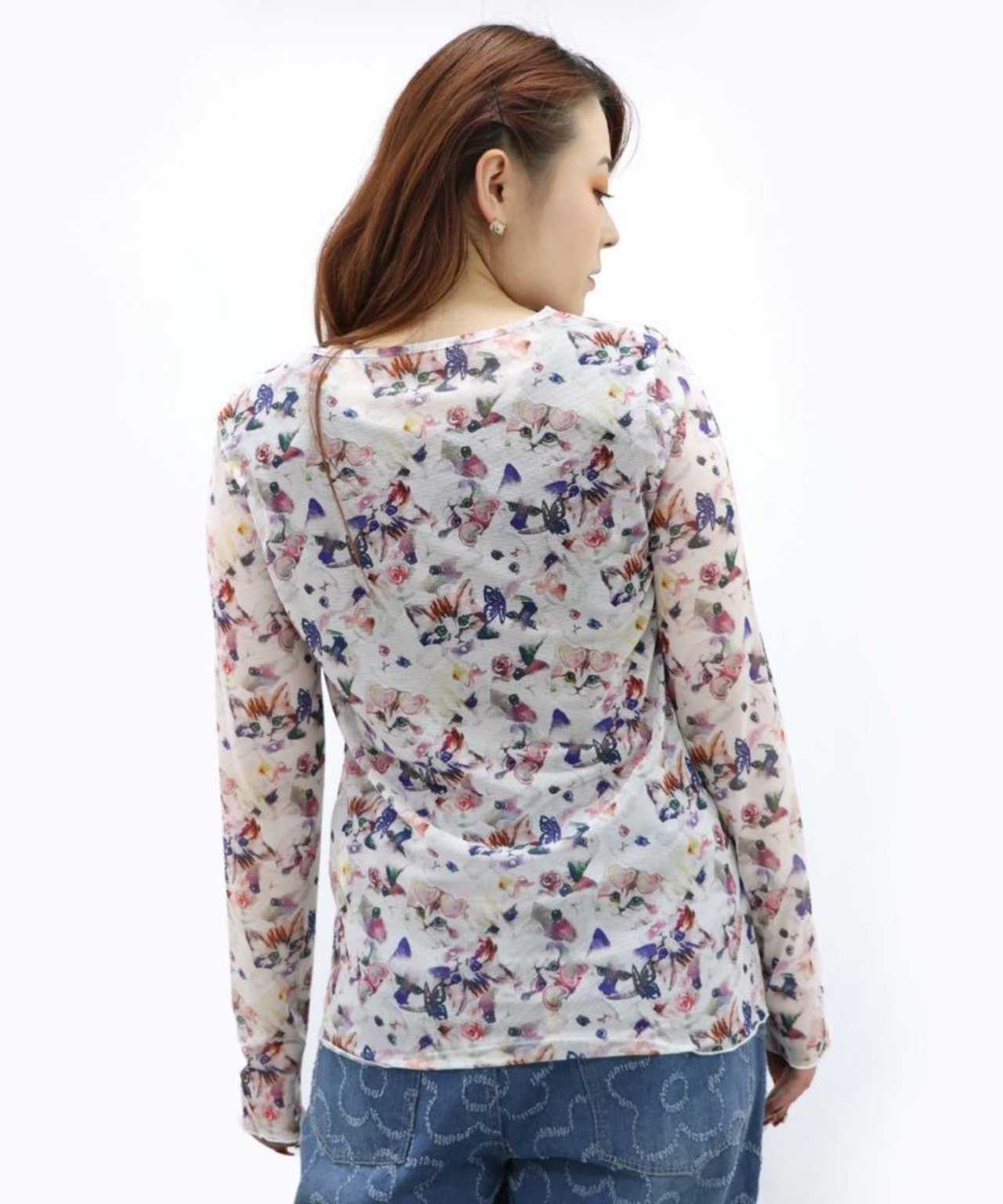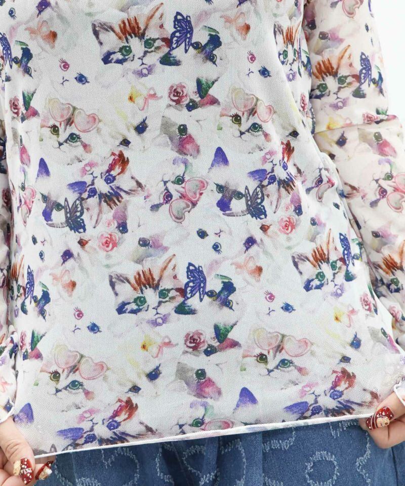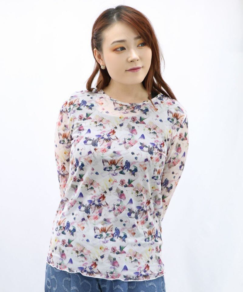 ScoLar(スカラー)蝶花ネコとウサギ 3柄展開チュールロングスリーブTシャツ オフホワイト、ブラック、グリーン 151608です。
