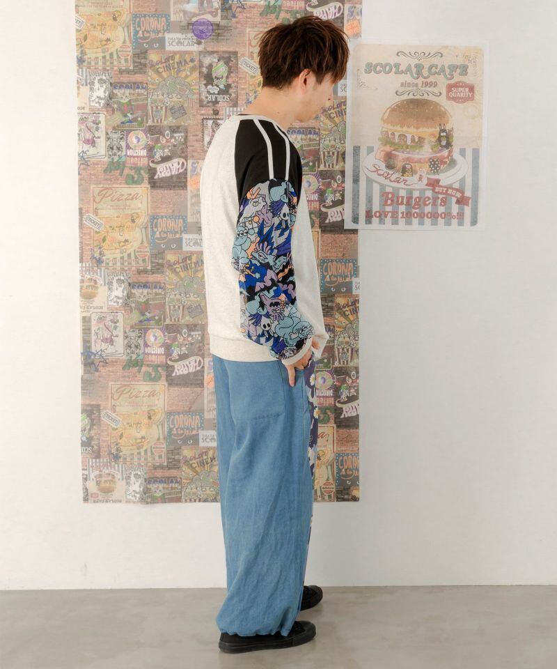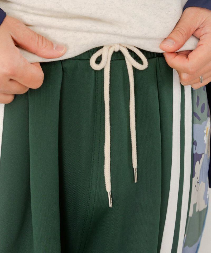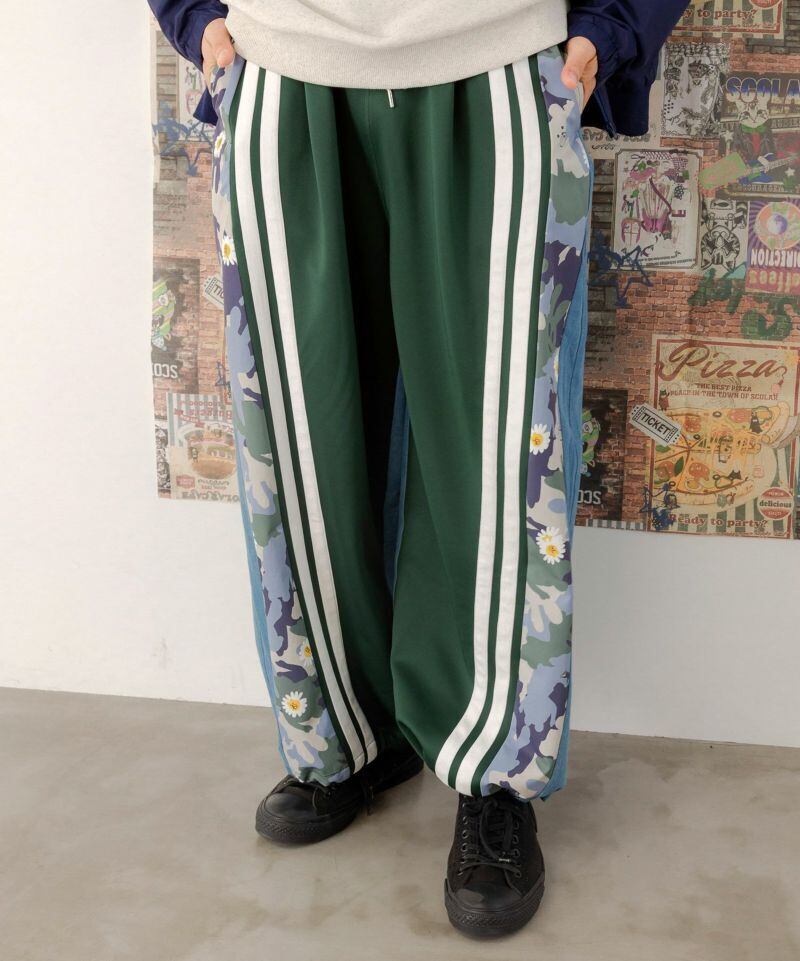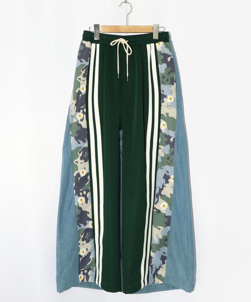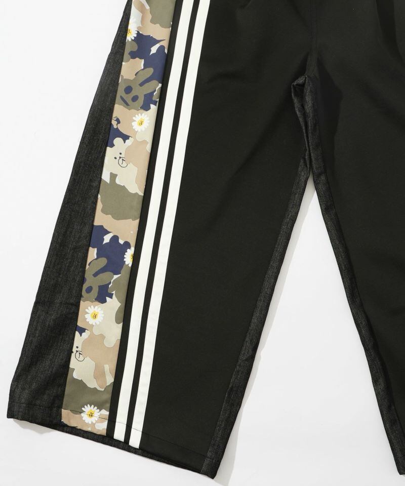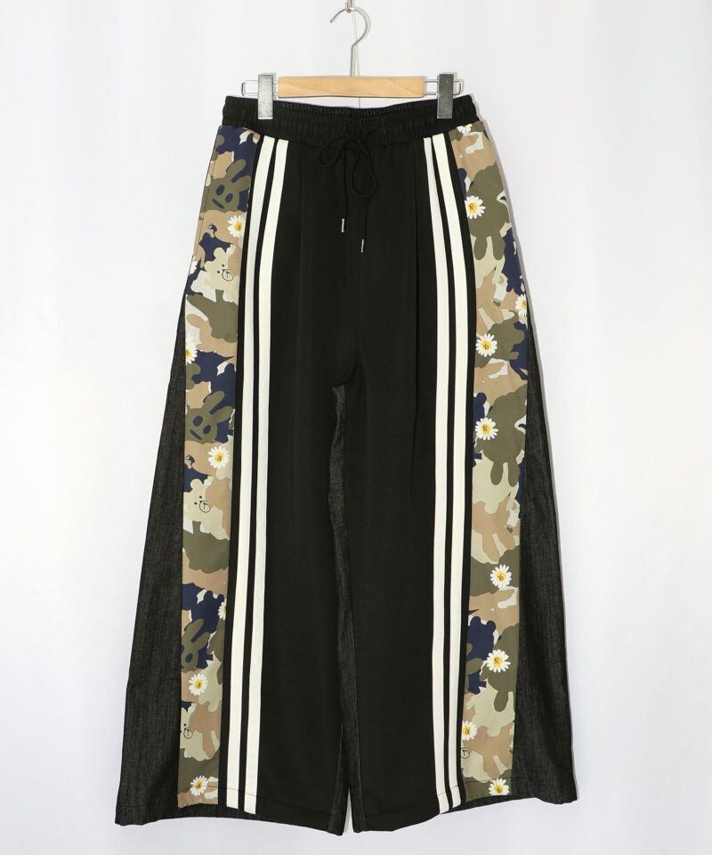 クマやウサギのカムフラージュ花柄が散りばめられたリメイク風ワイドパンツ。