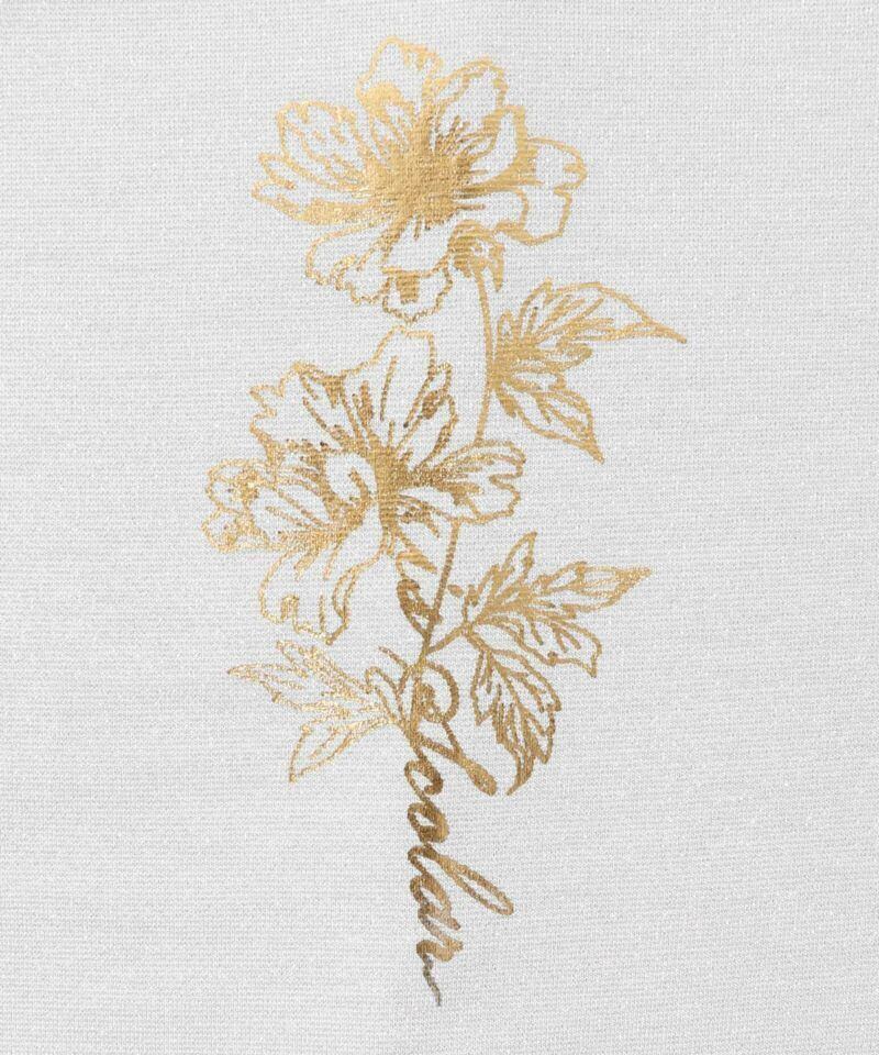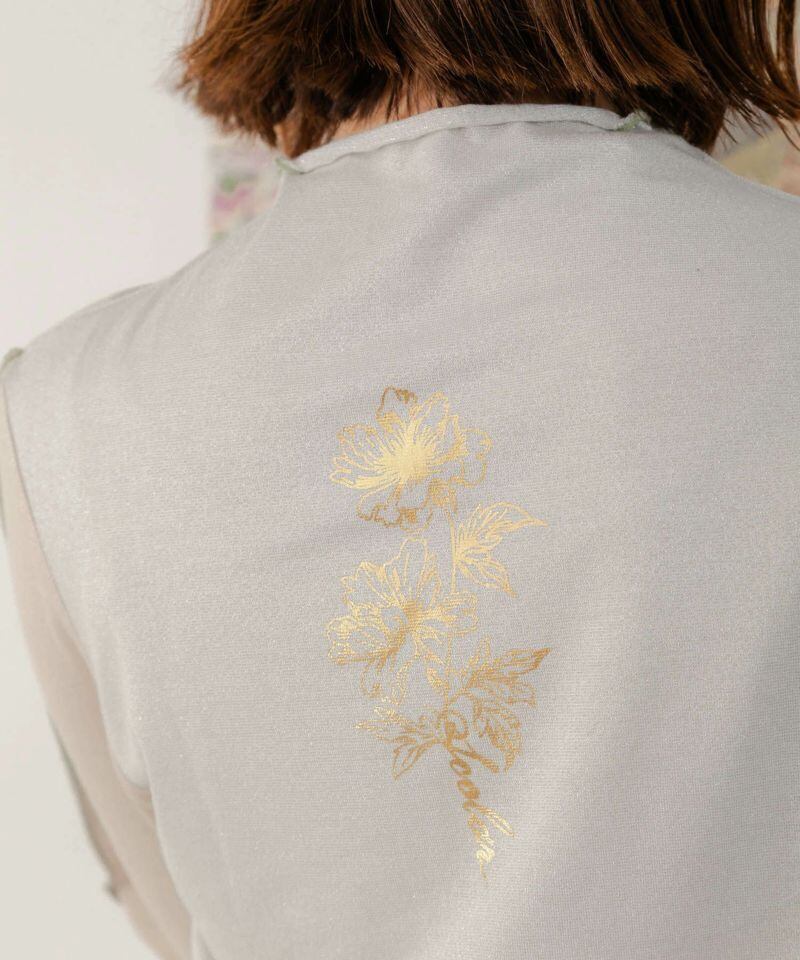 さらに後ろの首元にはお花柄ロゴを箔プリントで施し、程よくツヤっと光るアクセントに。